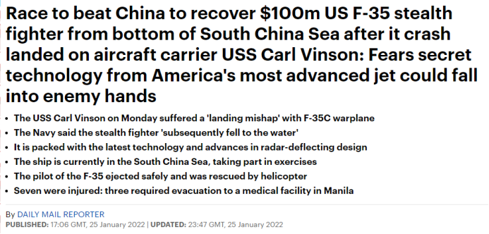 “降落时与卡尔·文森号航母碰撞后,美军急着抢在中国前面从南海海底收回价值1亿美元的F-35隐形战斗机:担心美国最先进战机的秘密技术可能落入敌人手中”,虽然没有交待任何依据,英国《每日邮报》25日的报道标题还是这样渲染道。