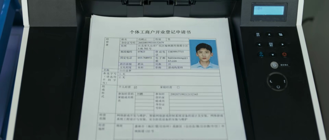 警方说肖鹤云是一个游戏公司的创始人,但是从打印机里打出的档案信息来看,却是一张《个体工商户开业登记申请书》!