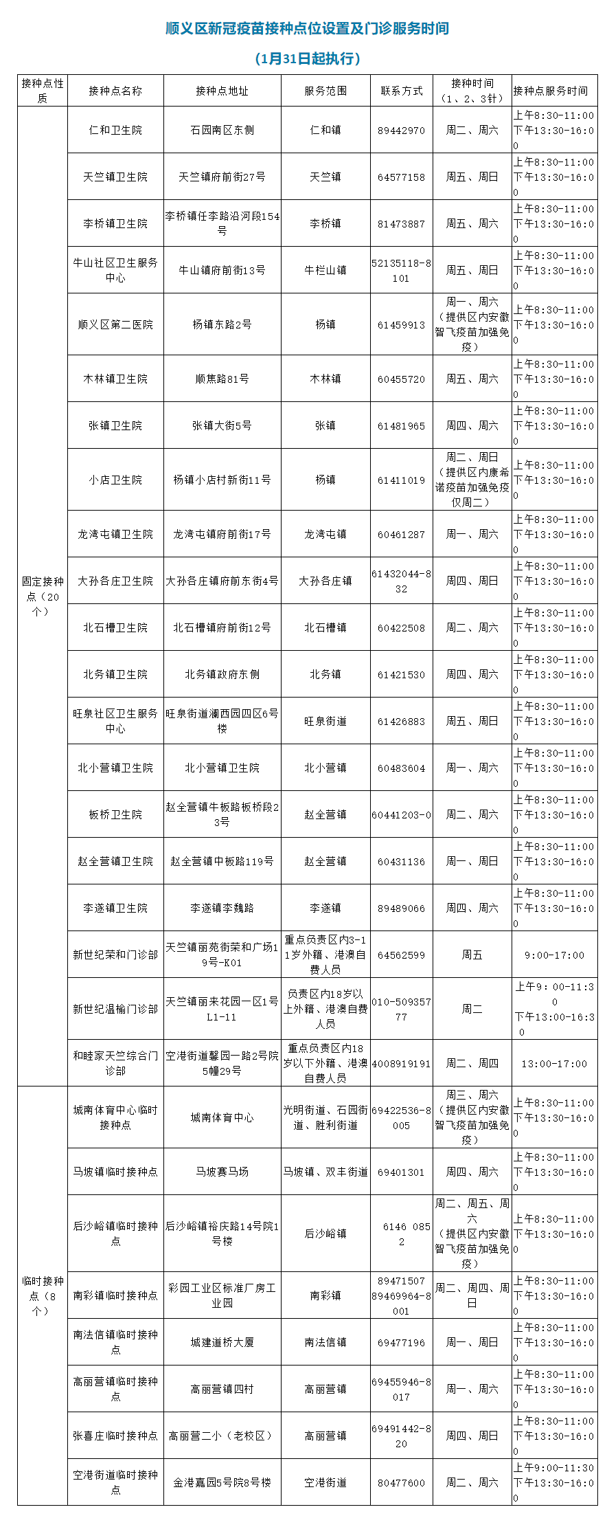 目前,顺义区新冠疫苗接种工作进展情况良好,为进一步构建免疫屏障,推进我区接种工作,统筹考虑区域便利性,合理配置医疗和保障资源,方便群众接种,自1月31日起,顺义区对区内新冠疫苗接种点位和接种时间进行调整。1月30日前,延续现有接种模式不变。