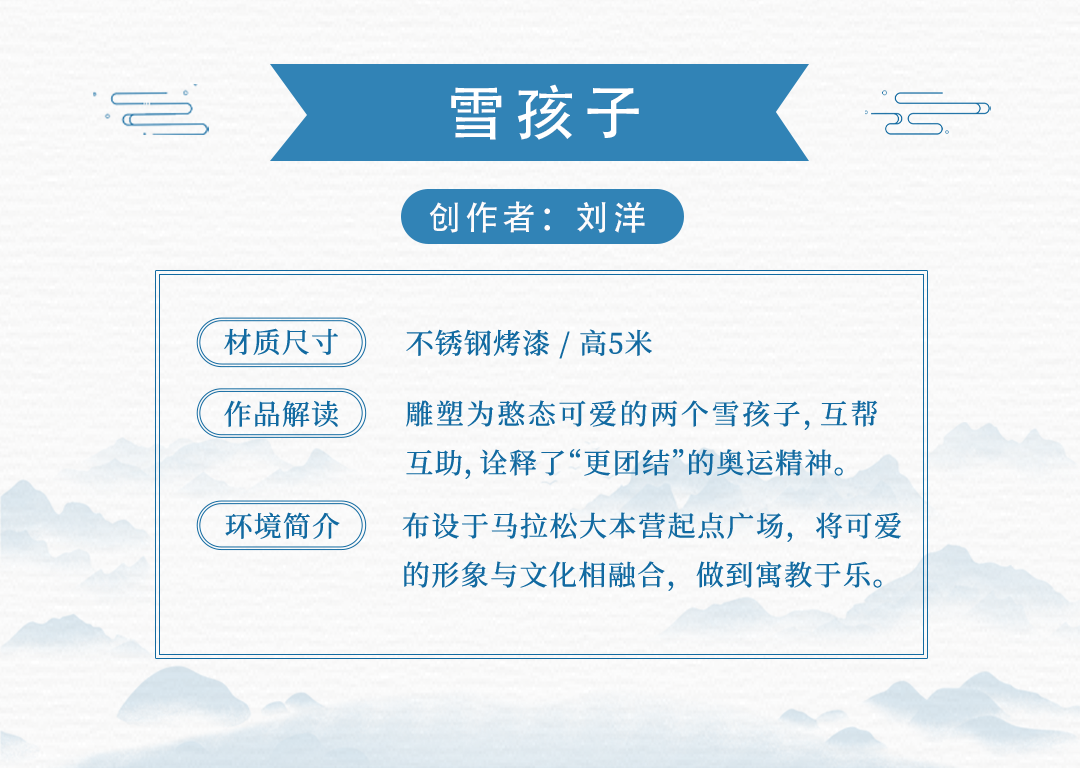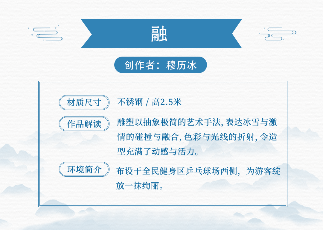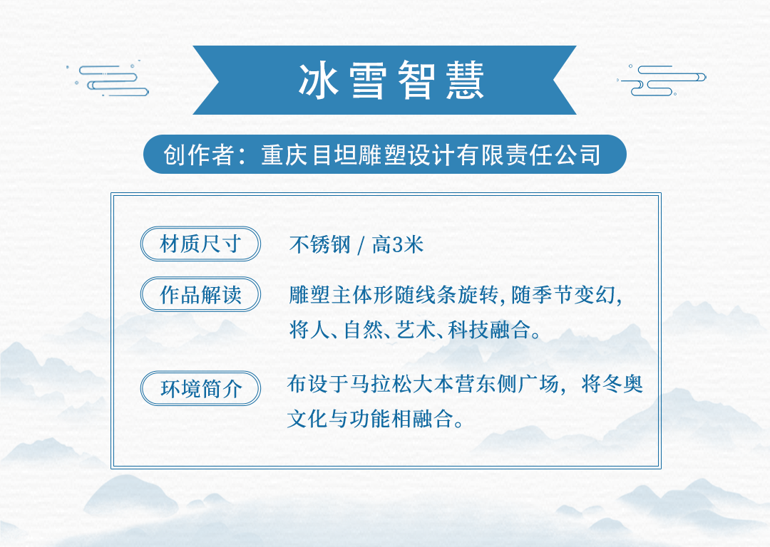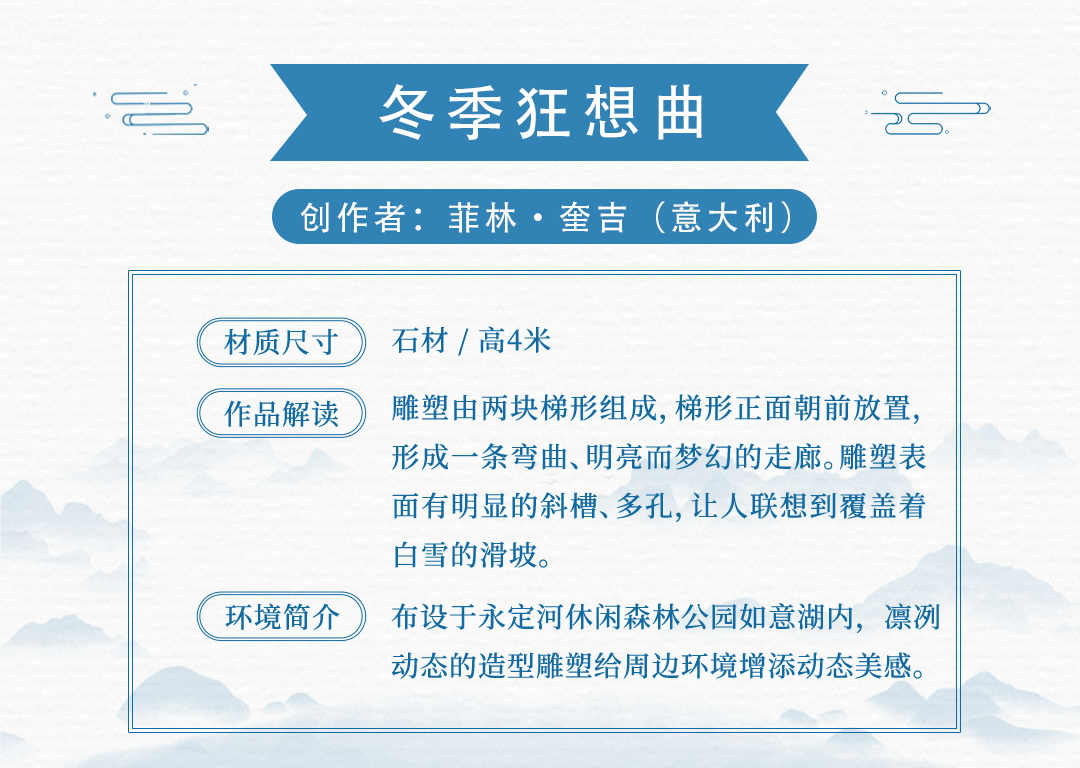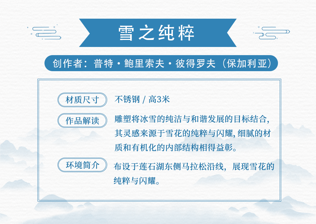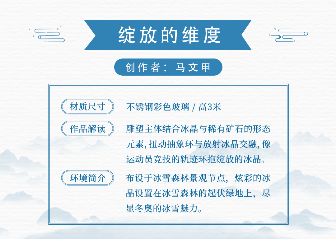 15件雕塑艺术品来源于中国、保加利亚、美国、土耳其、意大利、英国共6个国家15名应征人(单位),布设于冬奥文化展示区、户外四季体育区、综合服务区等景观节点。各个雕塑艺术品风格迥异,以独有的空间语言和造型方式,呈现出国际多元化的雕塑艺术文化。