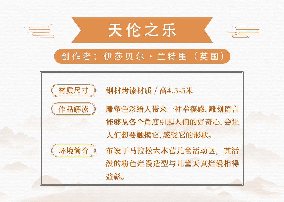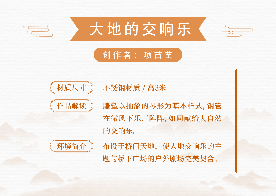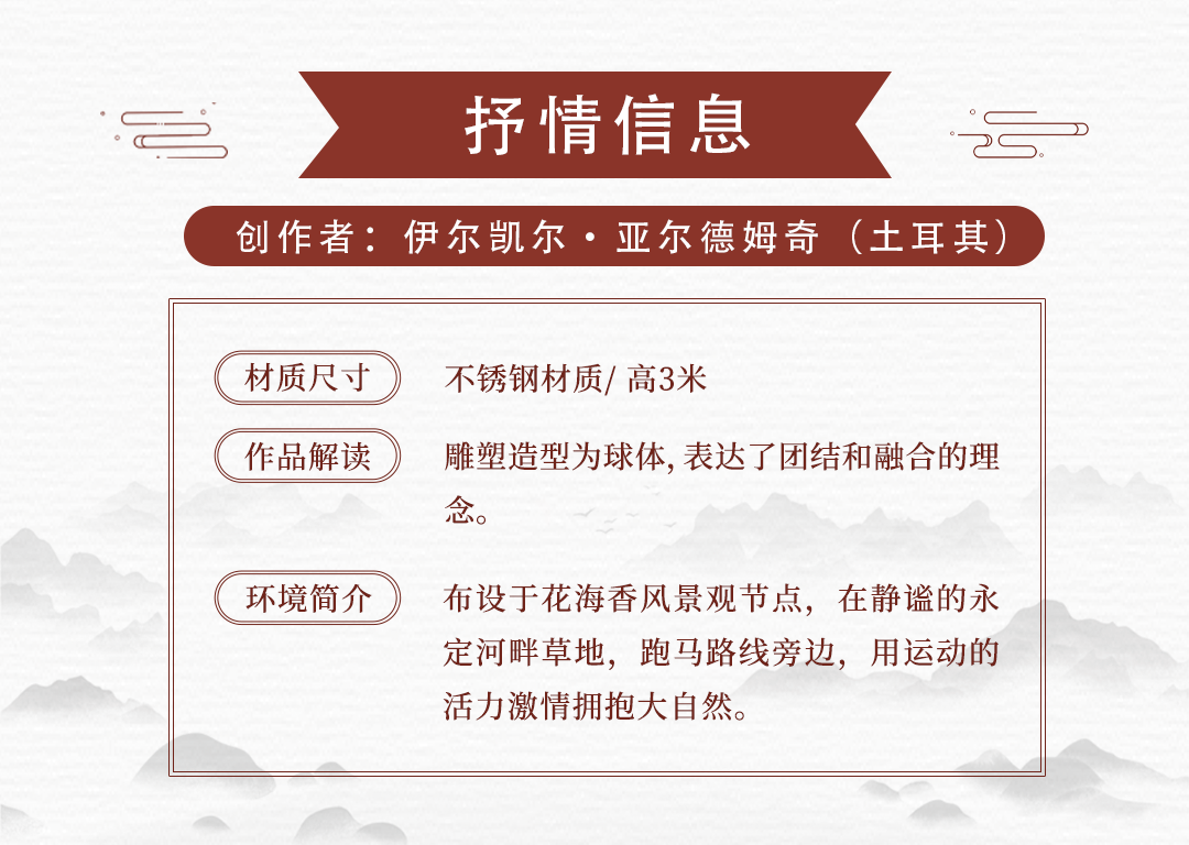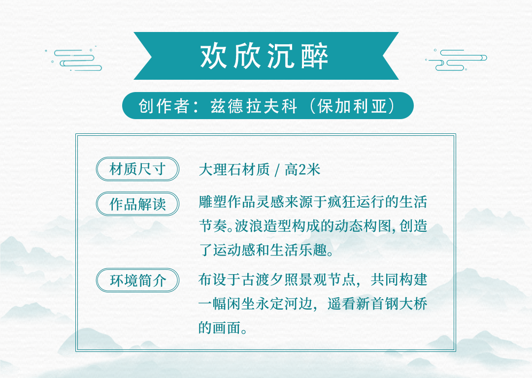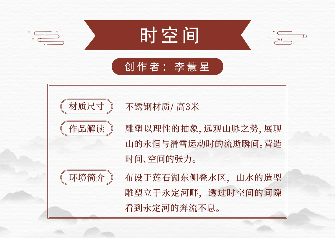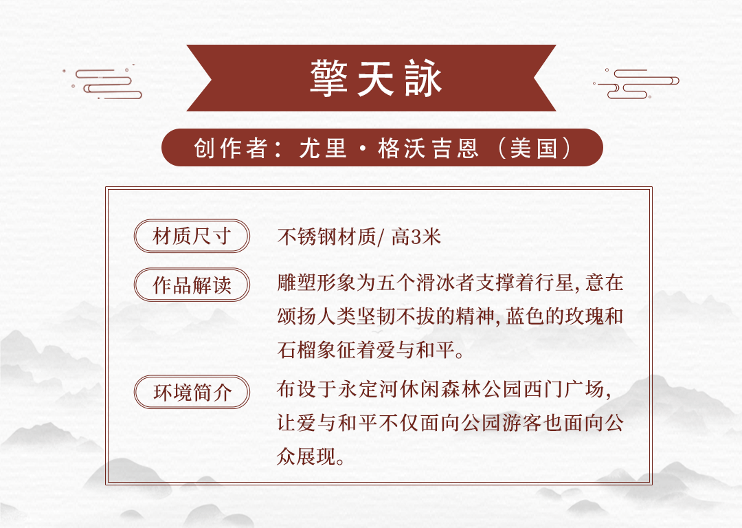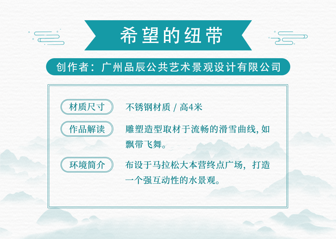 15件雕塑艺术品来源于中国、保加利亚、美国、土耳其、意大利、英国共6个国家15名应征人(单位),布设于冬奥文化展示区、户外四季体育区、综合服务区等景观节点。各个雕塑艺术品风格迥异,以独有的空间语言和造型方式,呈现出国际多元化的雕塑艺术文化。