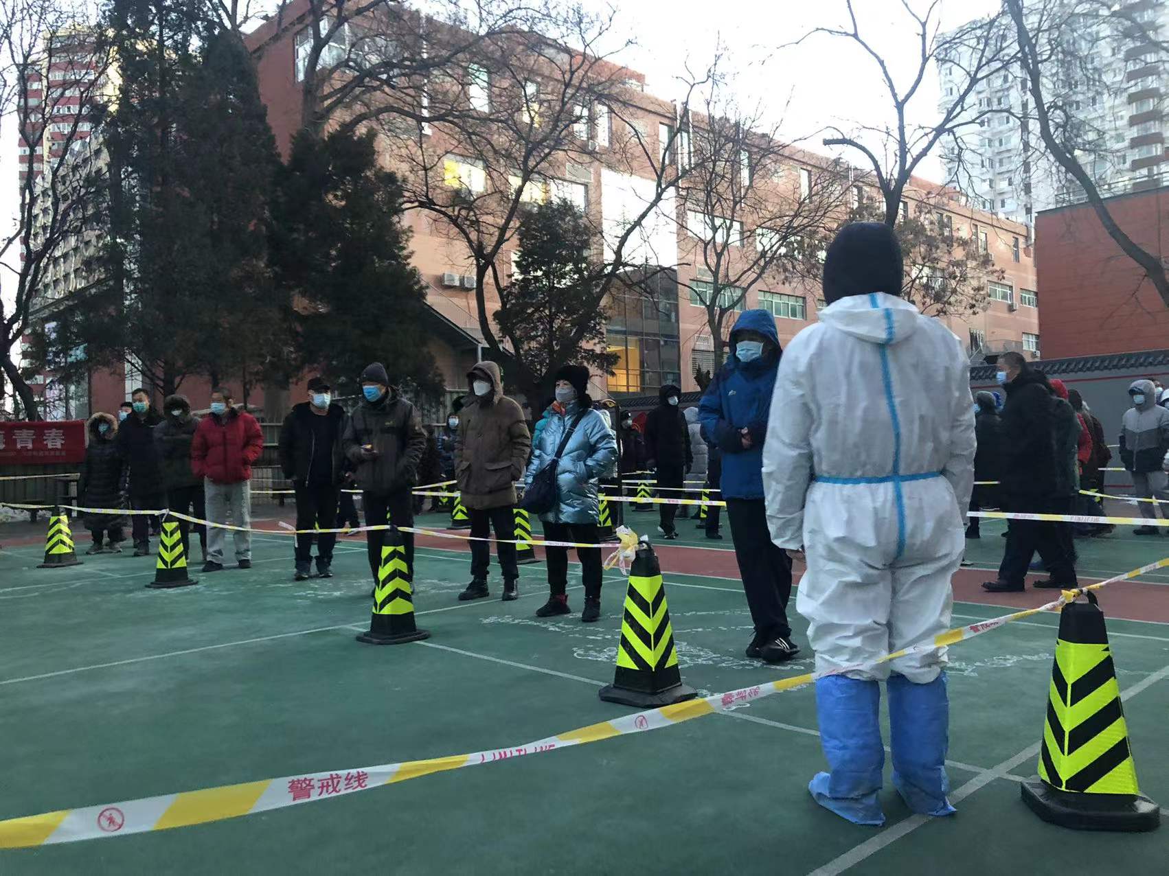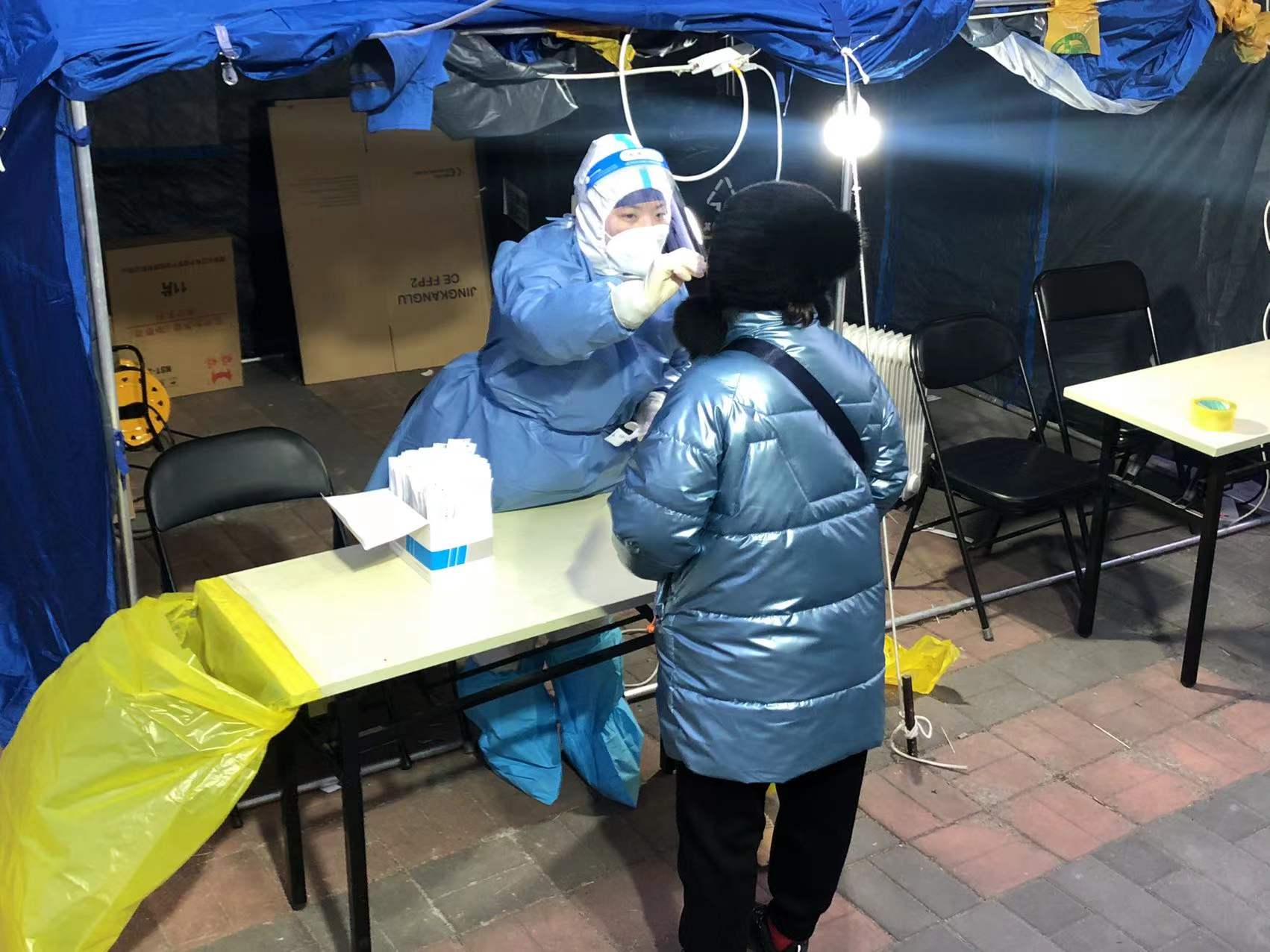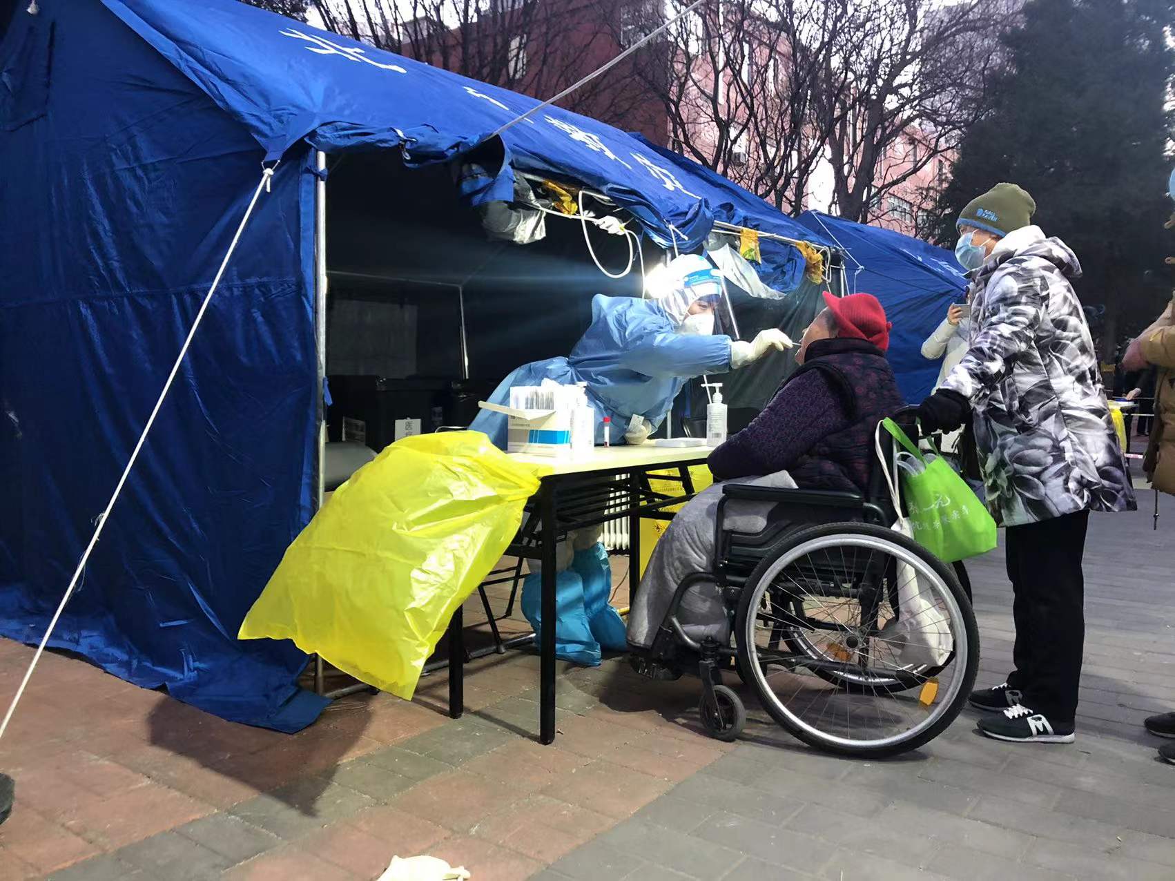 队伍里一位老人手拿着试剂盒,问正在做引导的社区工作人员:“昨天站这儿的就是你吧,我们来这么早,你们得几点起啊,可别累坏了。”听了这样的问话,工作人员湿了眼眶,“大妈,我们没事儿,您冷不冷?别着急,一会儿就到您了,做完核酸赶紧回家暖和暖和。”