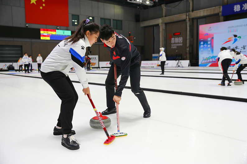 石景山冰壶队队员李天一与国家队队员同场竞技