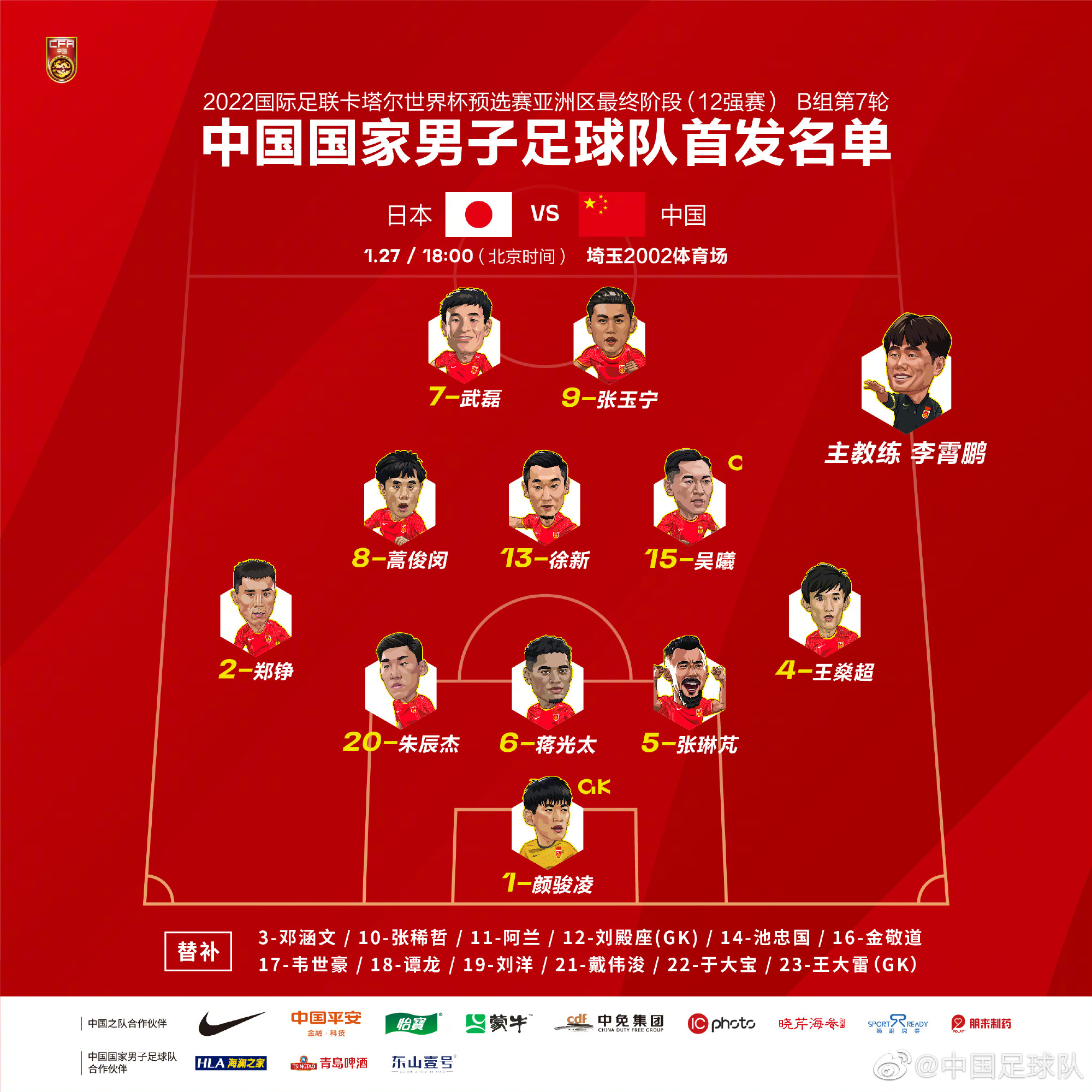 虽然锋线力量减弱了不少,但是因为一旦输球就将基本失去晋级卡塔尔世界杯的资格,因此李霄鹏依然排出了一个相对积极的532阵型。除了武磊和张玉宁领衔锋线外,吴曦、蒿俊闵和徐新坐镇中场,希望能够通过有效传接攻破日本队的球门。而日本队为了巩固小组第二的名次,本场比赛也是全力以赴,排出451阵型,其中大迫勇也顶在最前面,南野拓实和远藤航领衔中场。