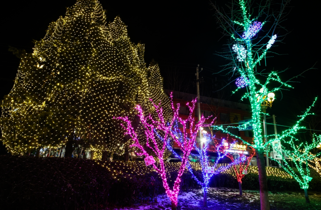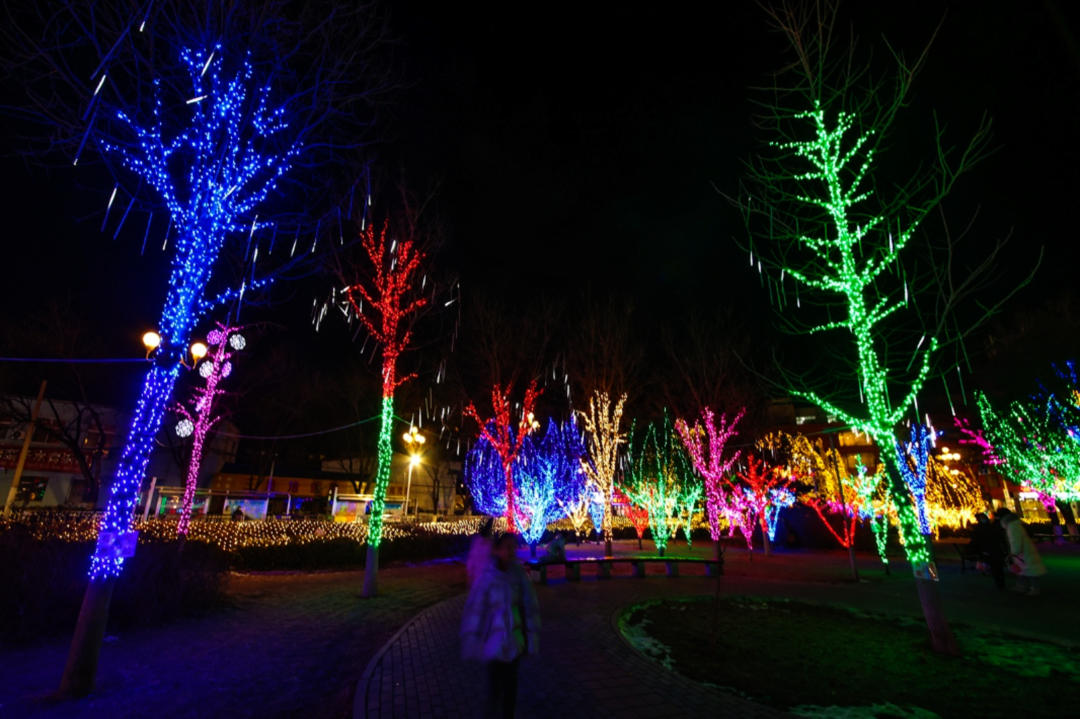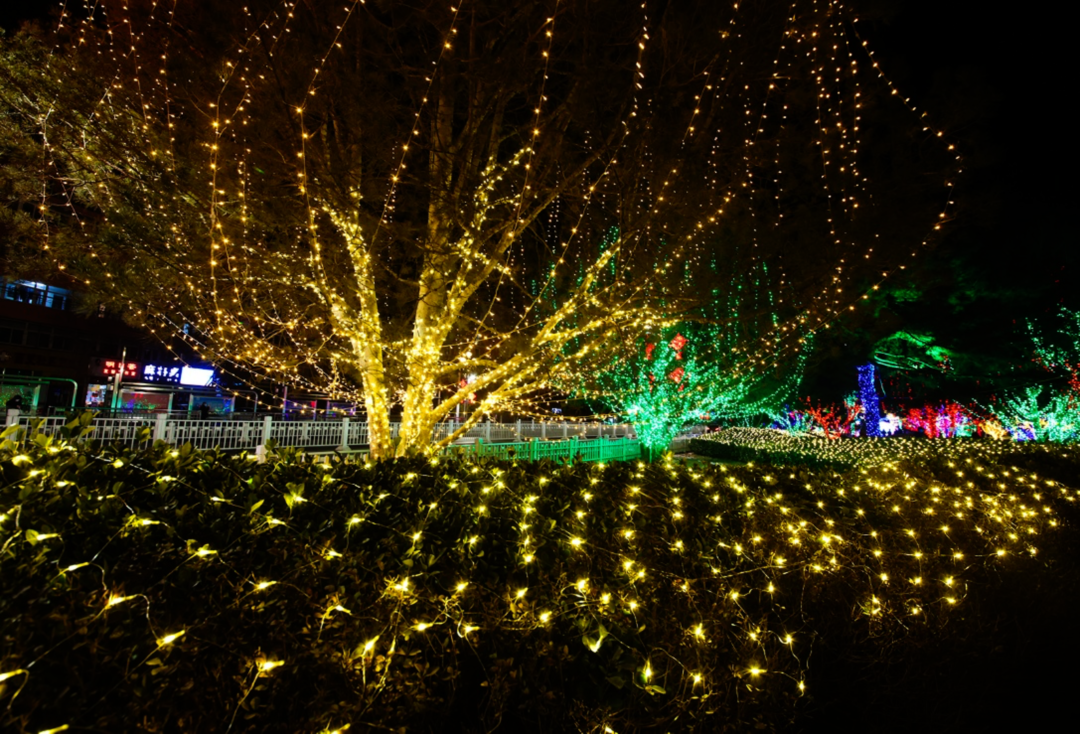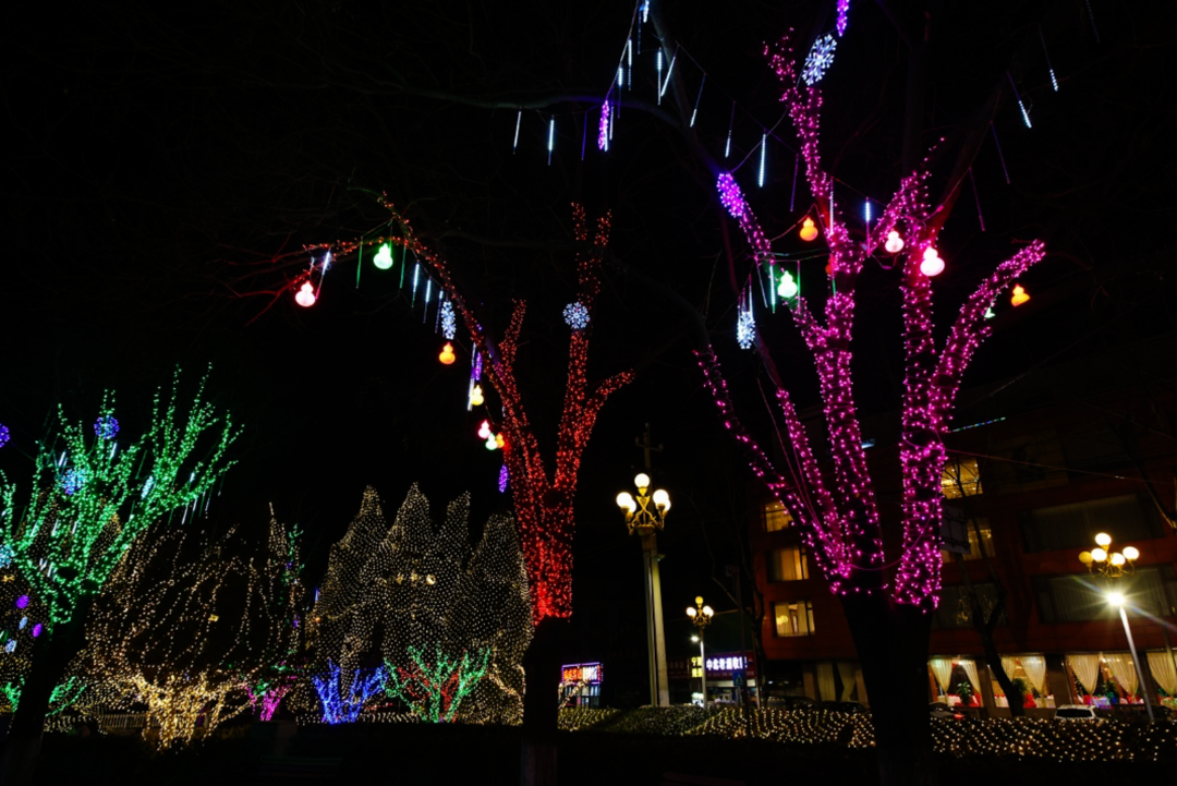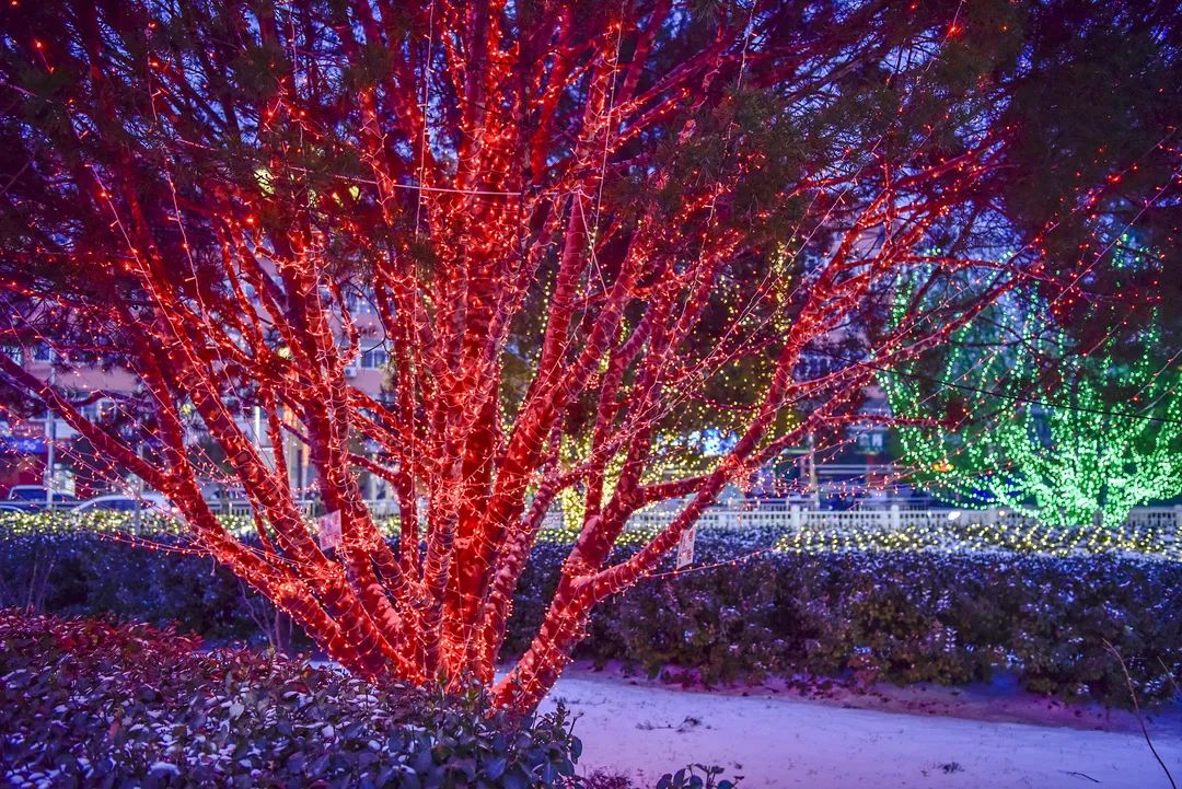 与周边缤纷的树灯、