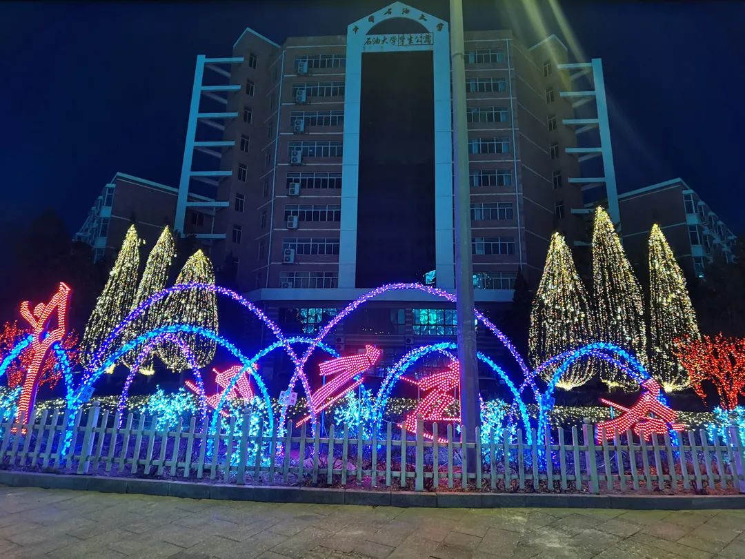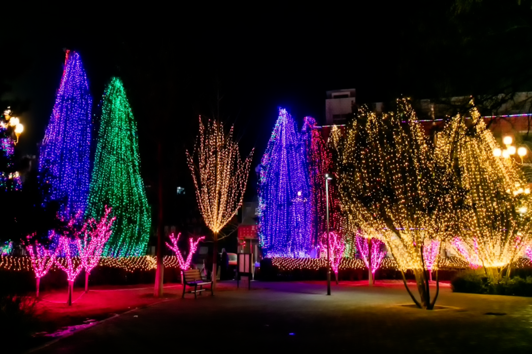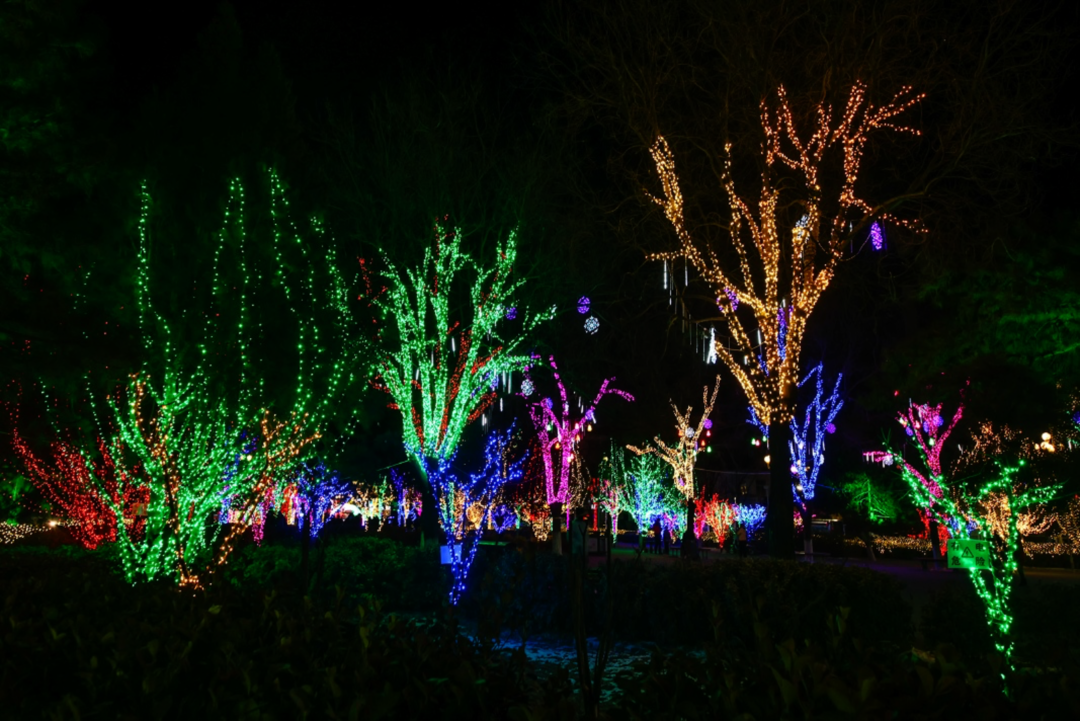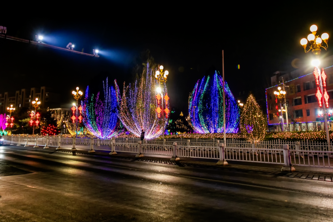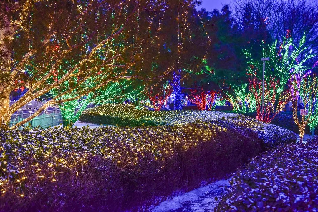 与周边缤纷的树灯、