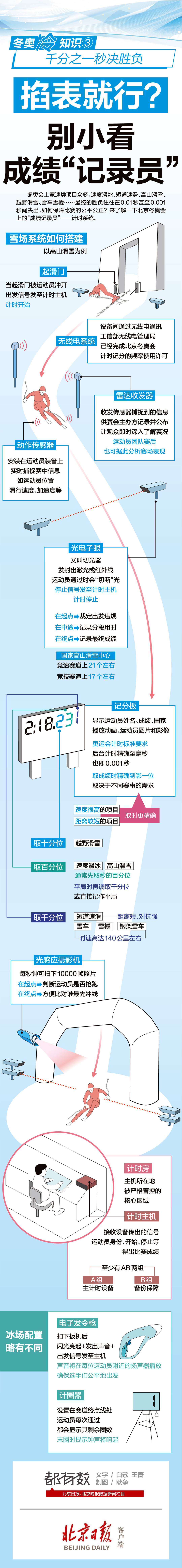 冬奥会上竞速类项目众多,速度滑冰、短道速滑、高山滑雪、越野滑雪、雪车雪橇……最终的胜负往往在0.01秒甚至0.001秒间决出,如何保障比赛的公平公正?来了解一下北京冬奥会上的“成绩记录员”——计时系统。
