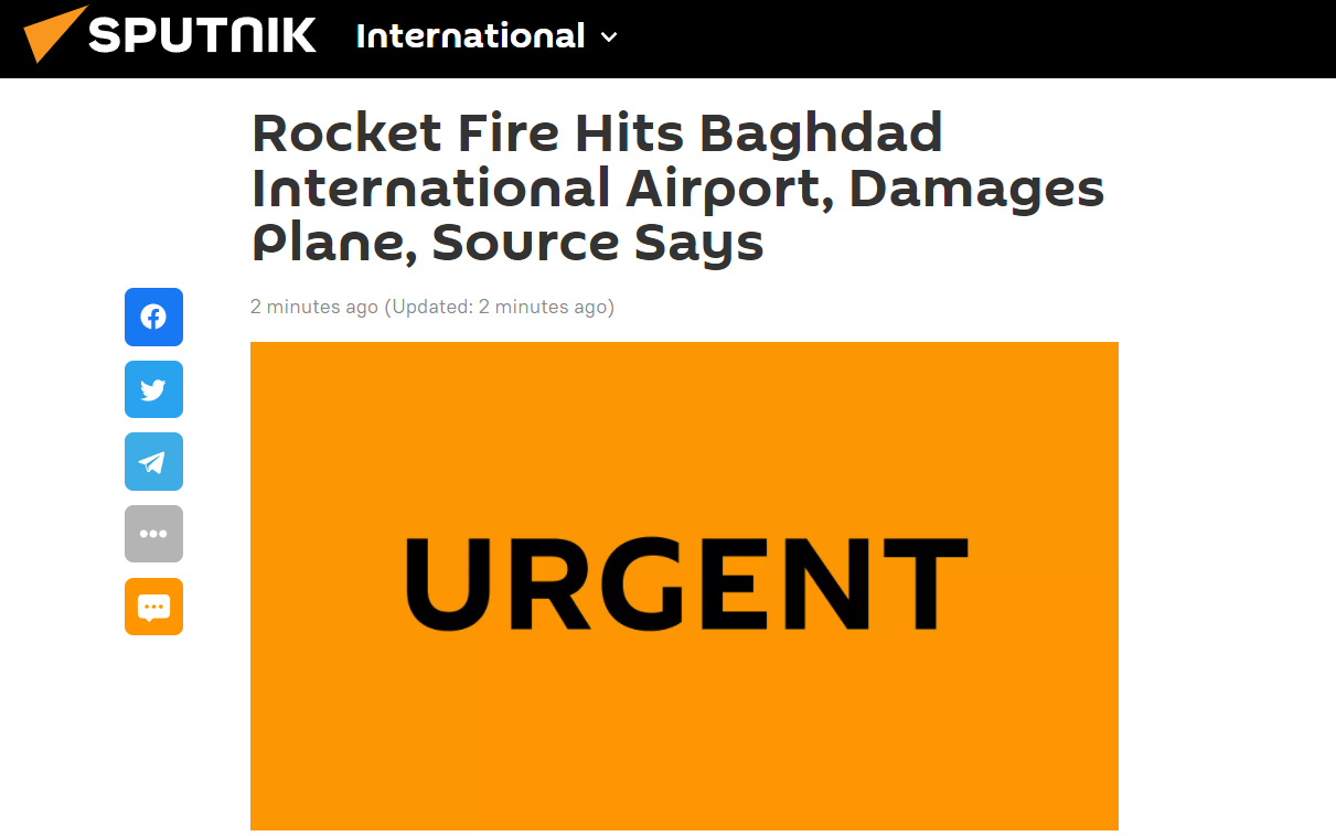 俄罗斯卫星通讯社刚刚消息,有消息称,伊拉克首都巴格达国际机场遭火箭弹袭击,机场有飞机受损。