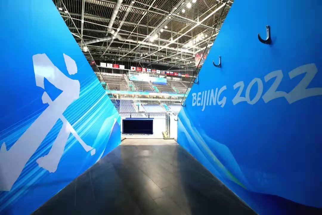 目前国家体育馆的景观布置工作已经全部完成。记者在国家体育馆内部看到,中间看台有两面大型蓝色背景的奥运五环,媒体席全部由蓝色板材搭建而成,每个场馆入口都贴上了冰球运动图标,“BEIJING 2022”标志随处可见。媒体混合采访区也已经搭建完成,据孙睿璇介绍,场馆媒体中心已经进入工作状态,28日上午已经有多名记者进入媒体中心进行工作。