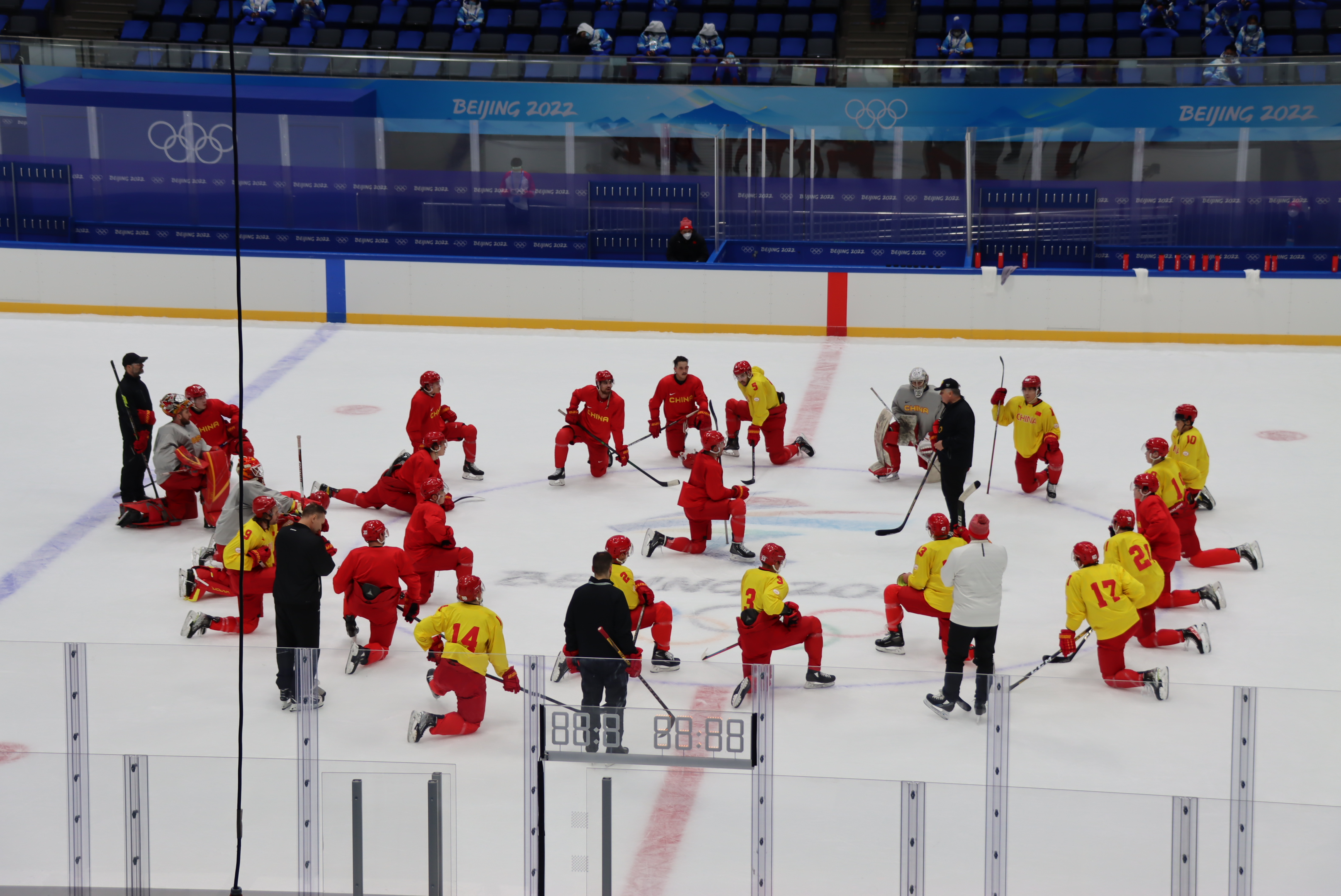 国家体育馆从1月7日开启小闭环管理,1月9日正式开启制冰工作。此次为国家体育馆改造完成以来的第四次制冰,前三次分别为2021年1月场馆改造完成后进行了首次制冰,2021年4月及11月的“相约北京”冰球测试赛进行了第二、第三次制冰。此次制冰于1月18日基本完成,制冰结束后,国家体育馆一直处于场地养护状态,直到28日中国男子冰球队首次踏上这块新制的冰面进行训练。