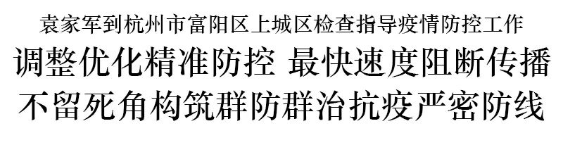 当前,杭州疫情防控正处于关键时期,杭州市富阳区、上城区均出现确诊病例。28日下午,省委书记、省新型冠状病毒肺炎疫情防控工作领导小组第一组长袁家军深入杭州市富阳区、上城区的封控小区、集中隔离点等重点场所检查指导疫情防控工作。他强调,要认真学习贯彻习近平总书记关于新冠肺炎疫情防控工作重要讲话重要指示精神,把疫情防控作为“国之大者”,围绕“控总量、防外溢、早清零”目标,全面激活完善“源头查控+快响激活+硬核隔离+精密智控”机制,全力弥补短板弱项查找漏洞,及时调整优化精准防控措施,进一步强化态势研判和不确定性管控,以最快速度阻断病毒传播,不留死角构筑群防群治抗疫严密防线,努力以最小代价最快速度打赢这场疫情防控遭遇战阻击战歼灭战。