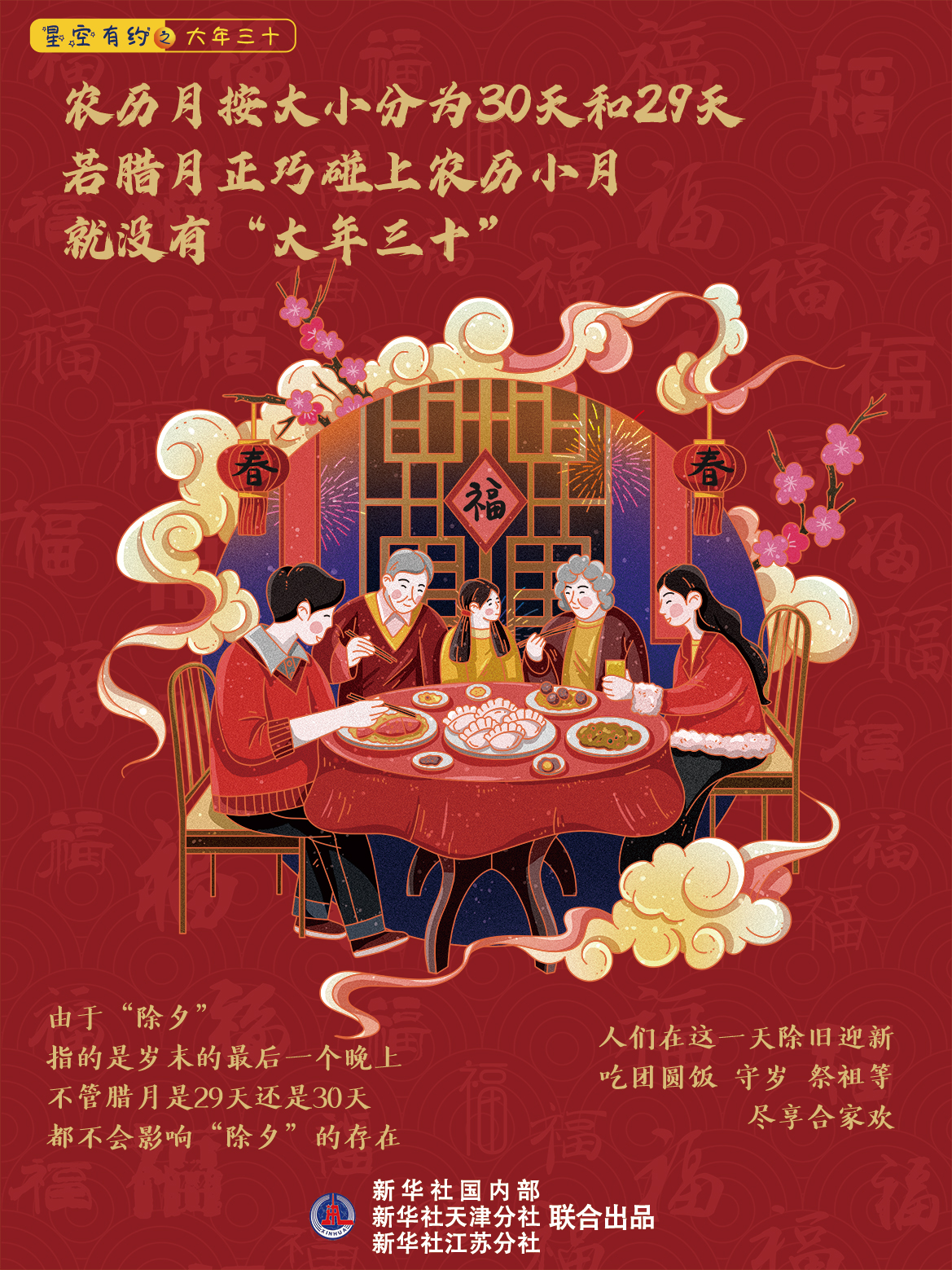 负责《中国天文年历》编算的中国科学院紫金山天文台副研究员成灼介绍,农历月主要根据月亮圆缺变化的周期而制定。在现代天文学中,已经可以根据月亮和太阳的高精度位置模型准确算出一整个月相的变化周期约为29.53天,这一周期被定义为“朔望月”。取整计数,农历月按大小分为30天和29天。如果腊月正巧碰上农历小月,就没有“大年三十”。