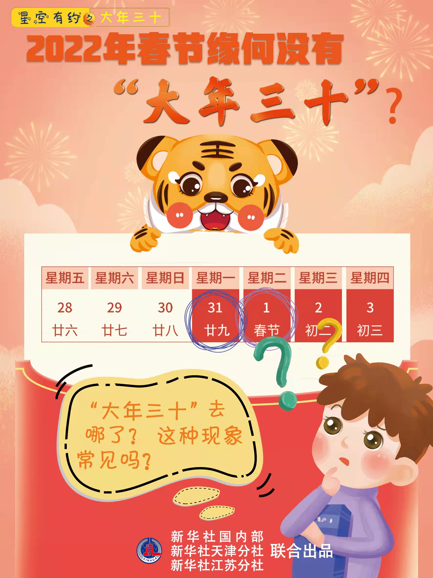 “新年到,真热闹!”年关临近,千家万户盈满了过年的喜气。廿八、廿九、初一……一些细心的公众在查看日历时发现,过了腊月二十九,就直通大年初一,并没有“大年三十”。“大年三十”去哪了?这种现象常见吗?