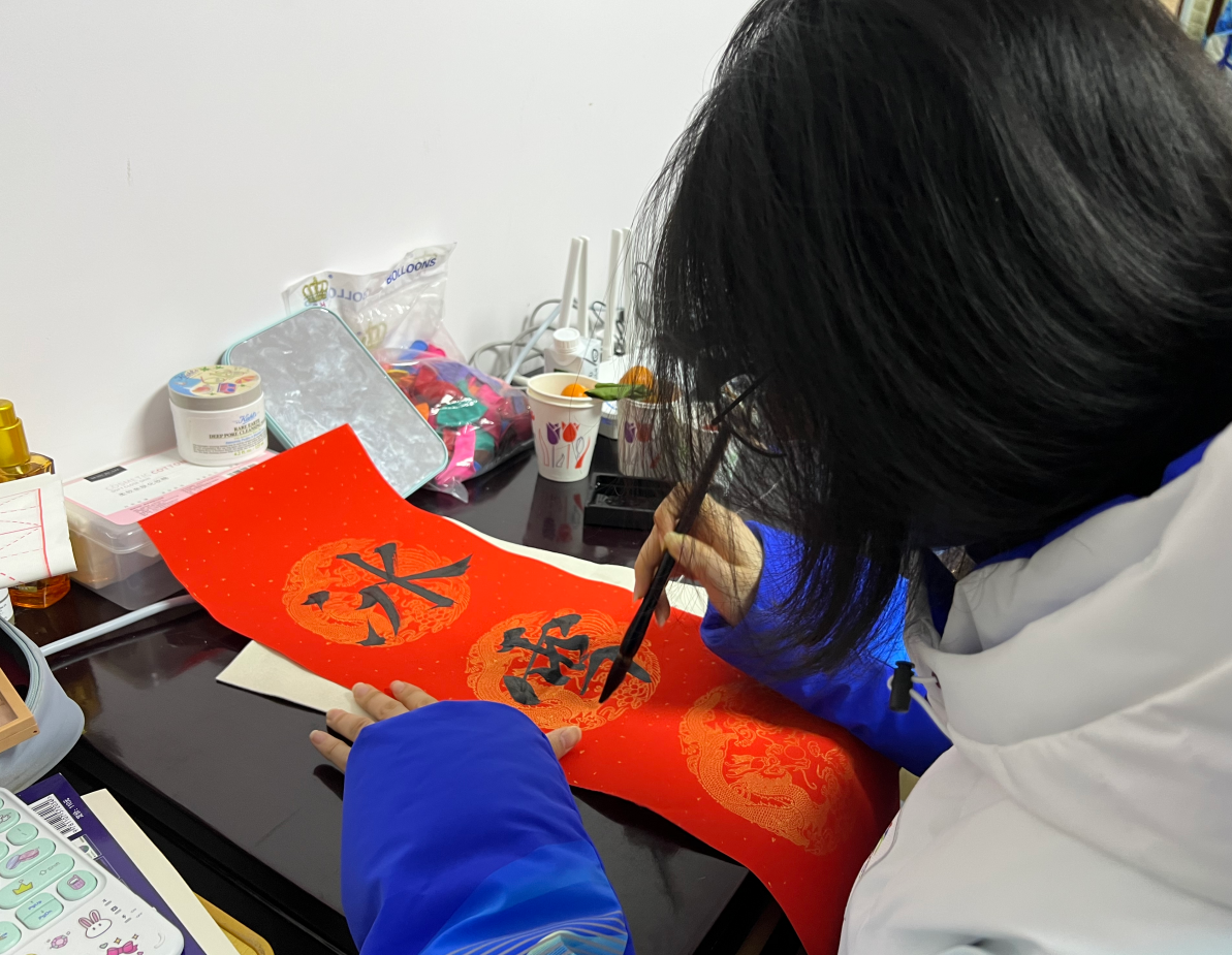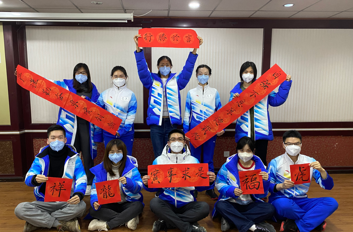 让志愿者们更加惊喜的是,为了让年味儿更浓,学校还准备了笔墨纸砚,供大家自己书写春联。“冰雪风采中国梦,健儿英姿时代盛。”在志愿者们的一片喝彩声中,一副“冬奥春联”诞生了。春联作者、北京化工大学2018级法学专业的孙妍表示,自己从小学开始学习书法,到了初中开始学习欧体,每年过年,家里的春联都是由她来写。今年春节期间恰逢冬奥盛会,于是她便创作了这副充满冬奥元素的春联。