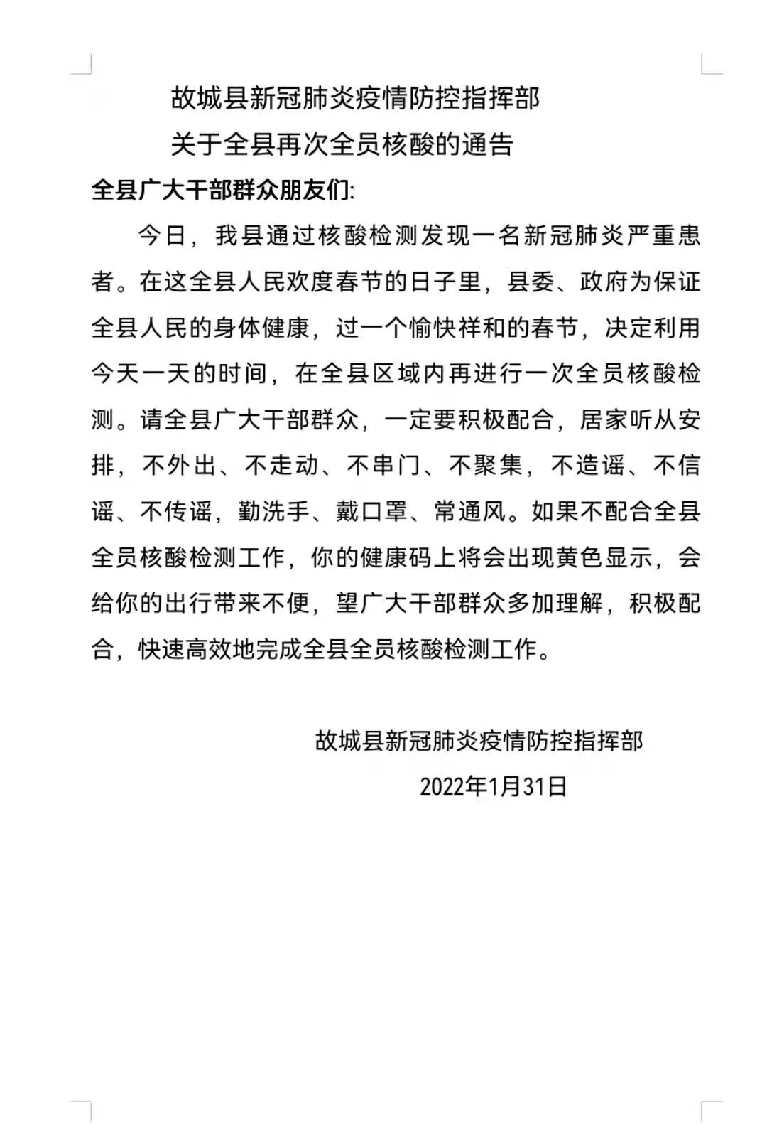 衡水故城县报告一例新冠肺炎严重患者,全县再一次核酸检测