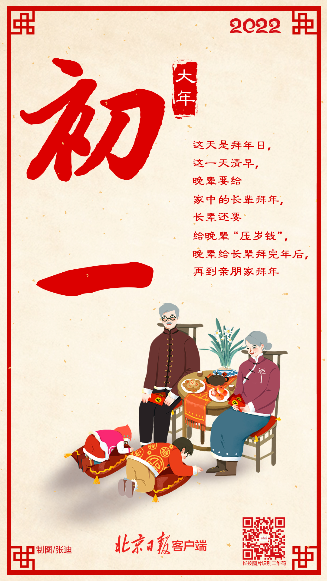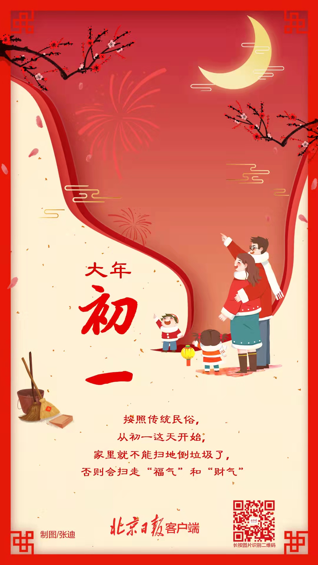 拜年贺岁:这天是拜年日,这一天清早,要给家中的长辈拜年,长辈还要给晚辈“压岁钱”,晚辈给长辈拜完年后,再到亲朋家拜年。从初一这天开始,家里就不能扫地倒垃圾了,否则会扫走“福气”和“财气”。