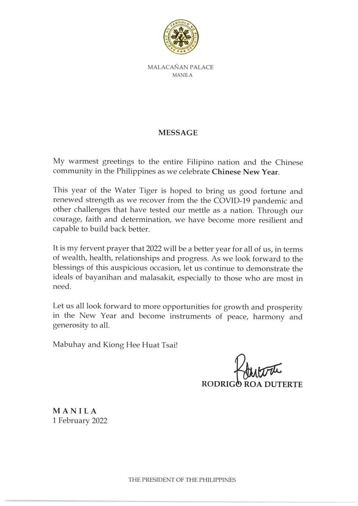 杜特尔特说,他热诚地恭祝全体菲律宾人和在菲华人新春快乐。虎年会为每个人带来财富,带来战胜新冠疫情及其他挑战的勇气。通过所有人的勇气、信仰和决心,大家能够变得更加坚强,更加具备把国家建设好的能力。