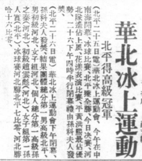 在冰球比赛中,北平队以七比零的分数大胜哈尔滨队,但不敌实力更强的河北队。哈尔滨队之所以未获佳绩,主要因为东北被日寇占领后,选手们流落在北平,平时缺乏练习。不过,他们参赛的主要目的不为夺得冠军,而是要警醒国人不可对日军的侵略行径掉以轻心。
