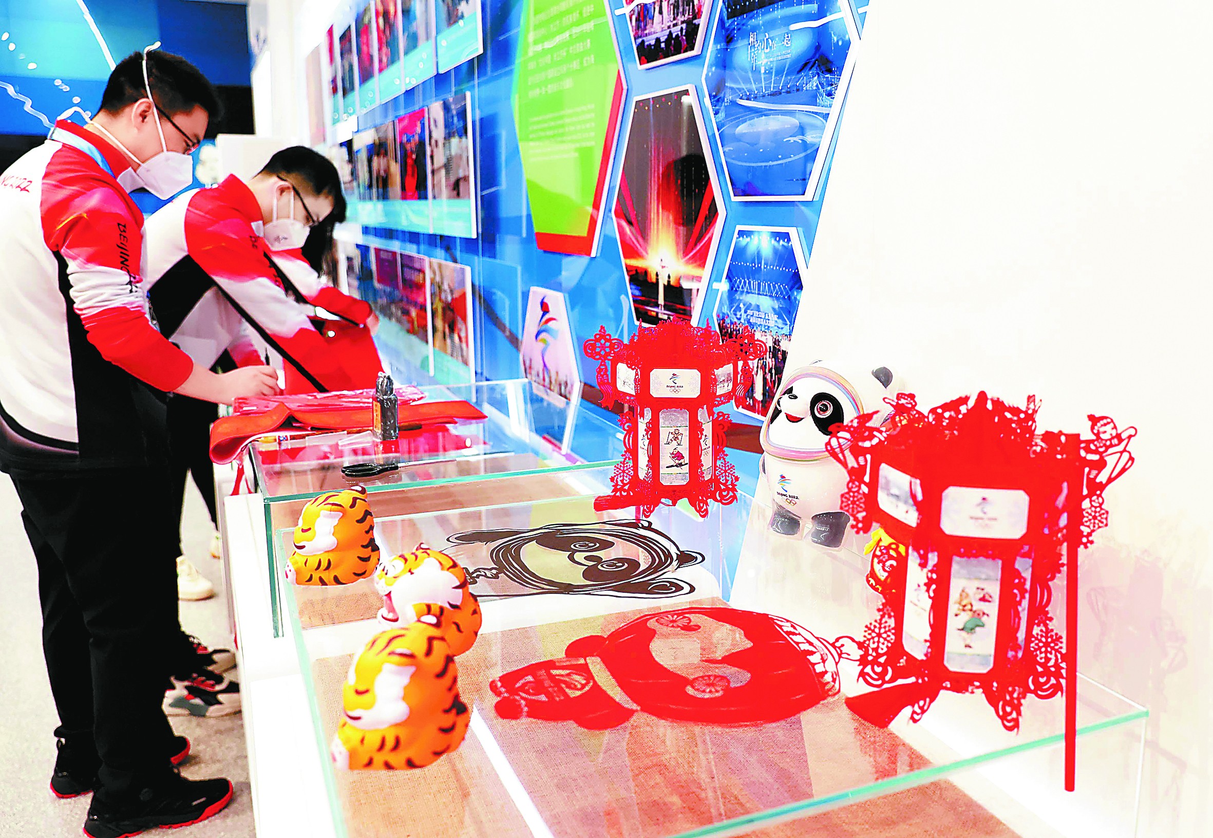 志愿者在国家游泳中心张贴福字,场馆内外中国味浓厚。