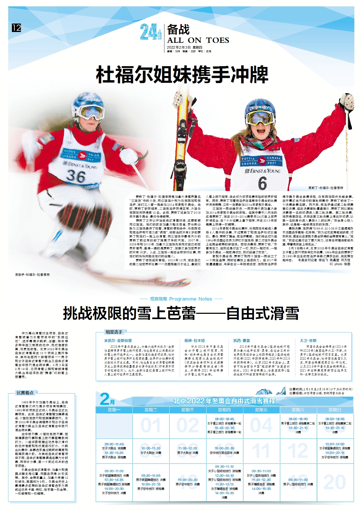 2月3日晚6点,北京2022年冬奥会自由式滑雪女子雪上技巧项目将拉开战幕,1994年出生的贾斯丁及1991年出生的克洛伊将再次携手出战,向奖牌发起冲击。