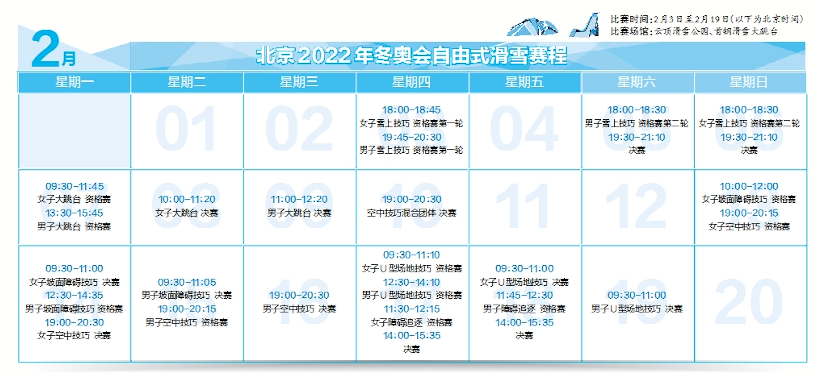 作为高山滑雪衍生项目,自由式滑雪被誉为冰雪项目中的“极限运动”,选手需展示跳跃、空翻、转体等多种华丽又刺激的动作,完成难度极高,观赏性很强。北京2022年冬奥会自由式滑雪将在13个项目上展开争夺,其中包括两个新增项目——男子和女子自由式滑雪大跳台及自由式滑雪空中技巧混合团体赛。2月3日至2月19日,云顶滑雪公园和首钢滑雪大跳台将迎来极限“舞者”们的雪上芭蕾秀。