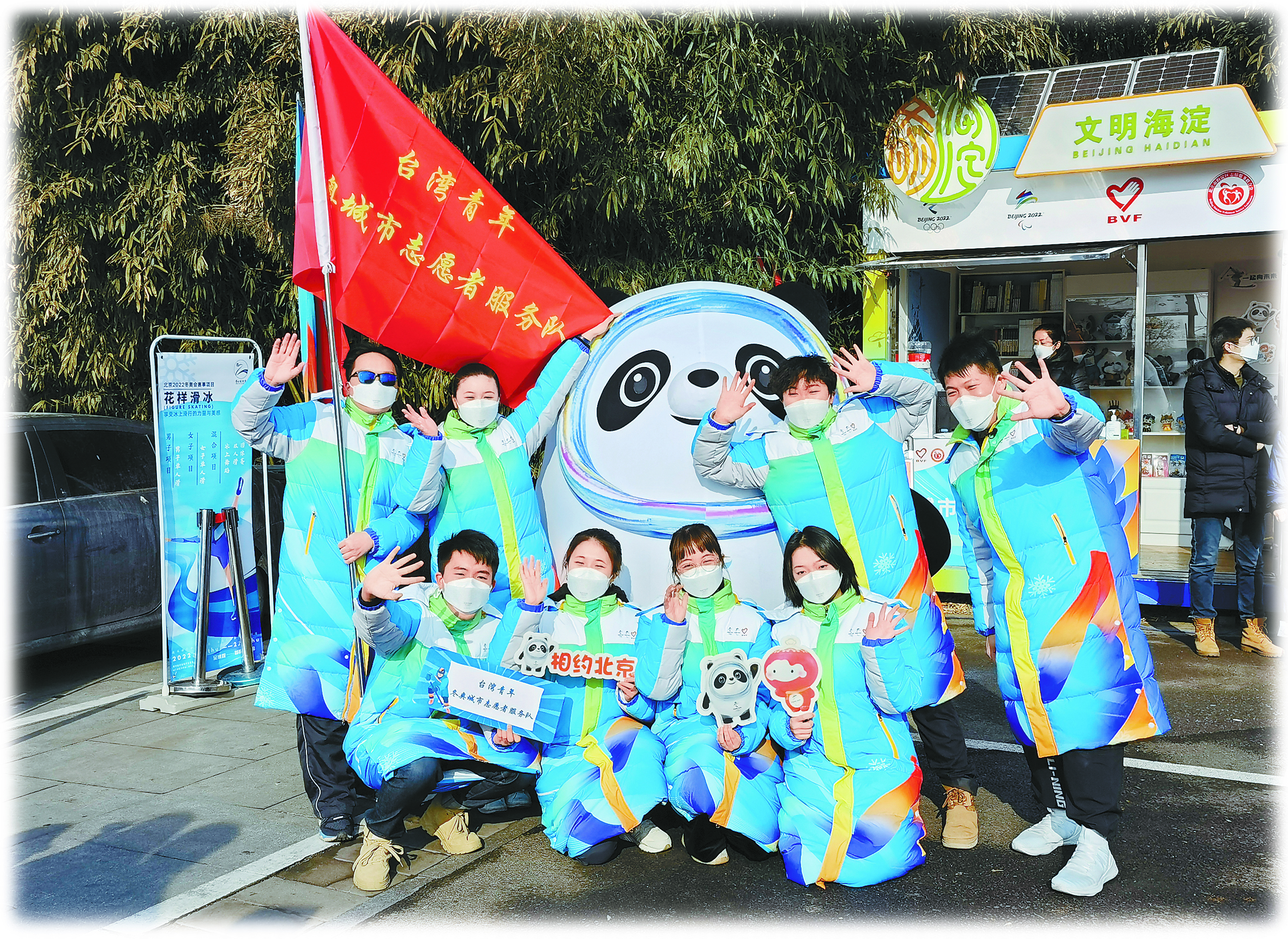 1月25日,陈文成(右一)与台湾青年冬奥城市志愿者服务队一起进行志愿服务。