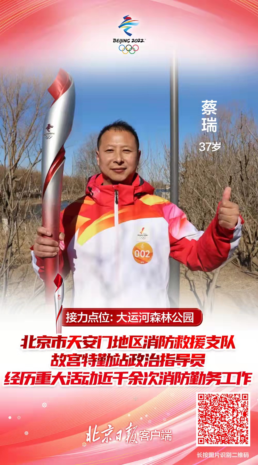 这次参加火炬接力,蔡瑞感到非常高兴和自豪。来到接力活动现场,他第一眼就看到了现场参与保障工作的消防车。“这是我们的战友,大家都在坚守一线,服务保障北京冬奥会。”蔡瑞说,火炬接力后,他也将第一时间回到工作岗位,参与相关保障工作。