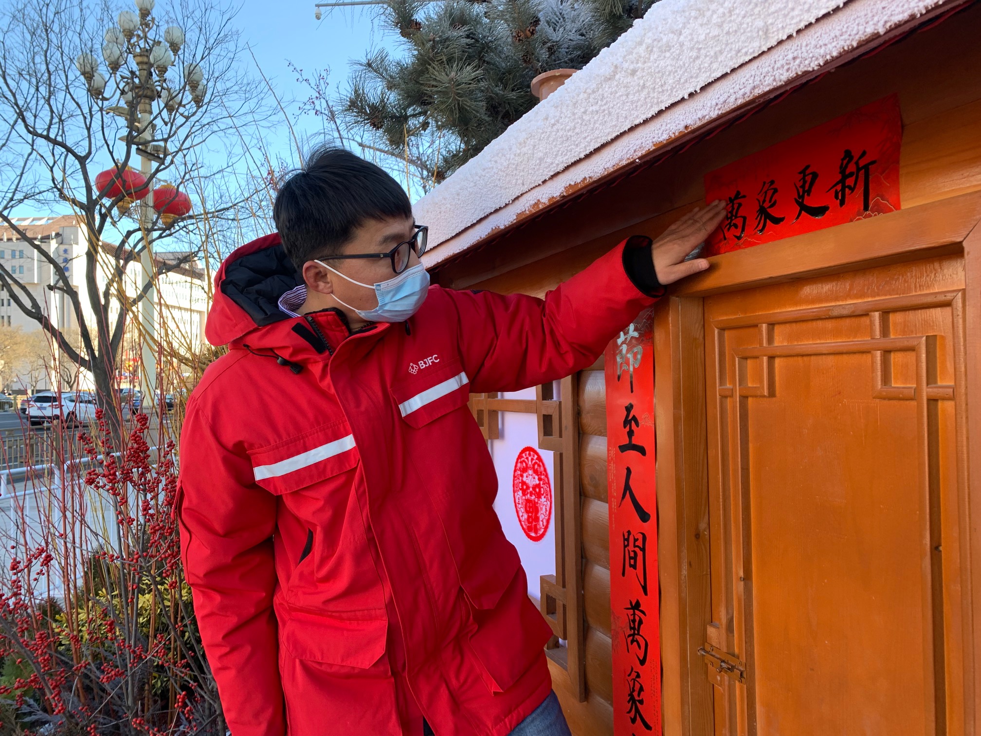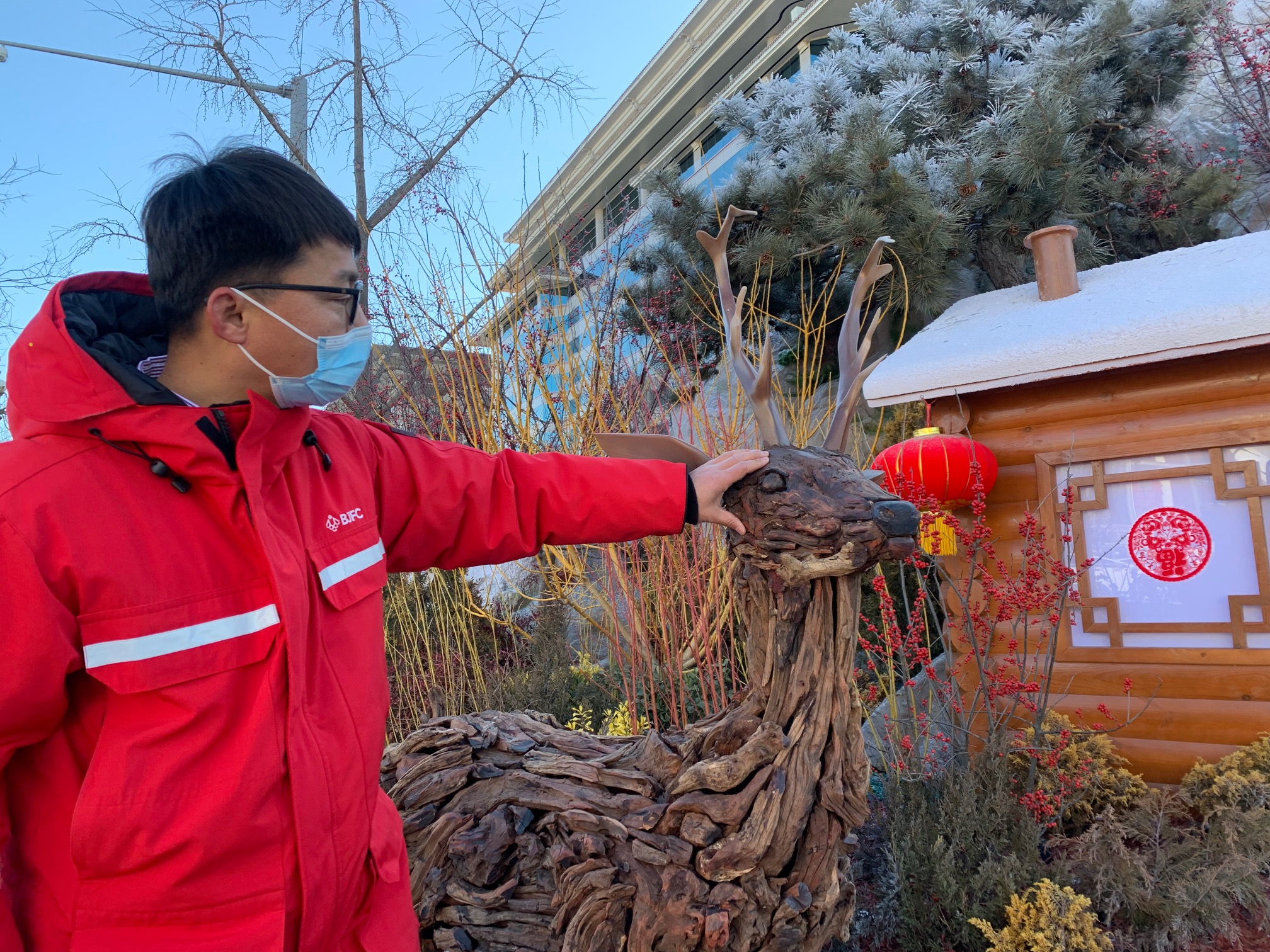 被风吹落的枯枝要及时清理,被刮进花坛的垃圾要随时捡拾,被吹歪的景观、植物、装饰品要立刻扶正,就连小木屋门前的春联要贴得严丝合缝才行……北京冬季多风,因此,很多巡检项目都和防风有关。“冰天雪地”花坛中,振翅高飞的锦鸡、跃上枝头的喜鹊、凝神注目的小鹿、活泼可爱的小兔等等动物形象,其实都是用不同的树枝编织而成,随后又被固定在山石、树木或是地面上。花坛中像是树枝编织动物之类的每一处“小部件”,张超都会走上前去摸一摸、晃一晃,确保每个细节部件“各就各位”、稳固结实。路过花坛中的滑冰儿童、冰墩墩和雪容融等雕塑,他又停下脚步,细心将景观小品上的浮土轻轻掸掉。