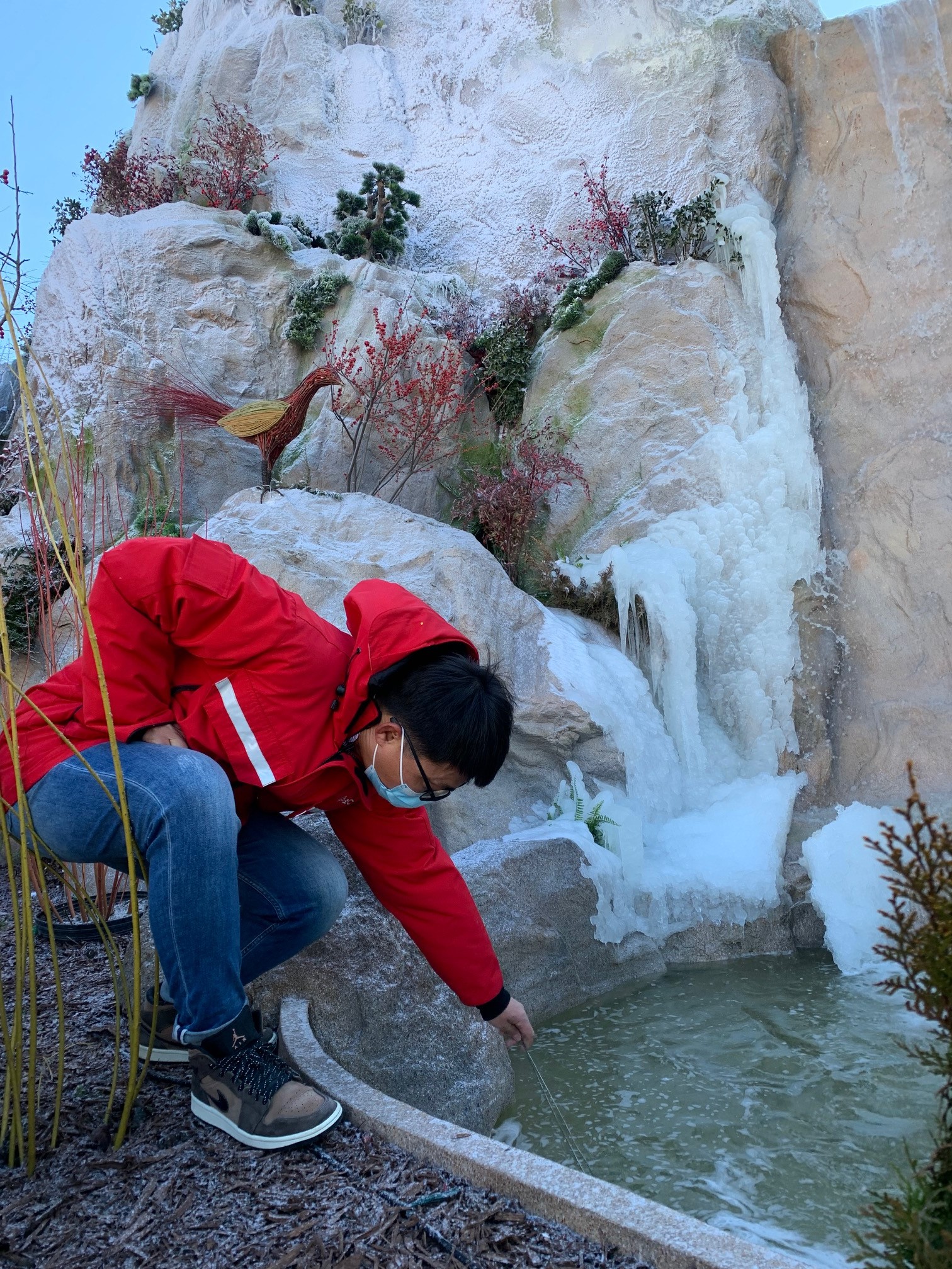 绕过一丛丛绿植,记者惊讶地发现,飞瀑下竟隐藏着一潭清澈的池水。原来,这是瀑布的蓄水池。北京冬季干燥,瀑布在水花飞溅过程中,很容易造成水分蒸发,因此,瀑布的储水量必须确保每日正常的水循环才行。