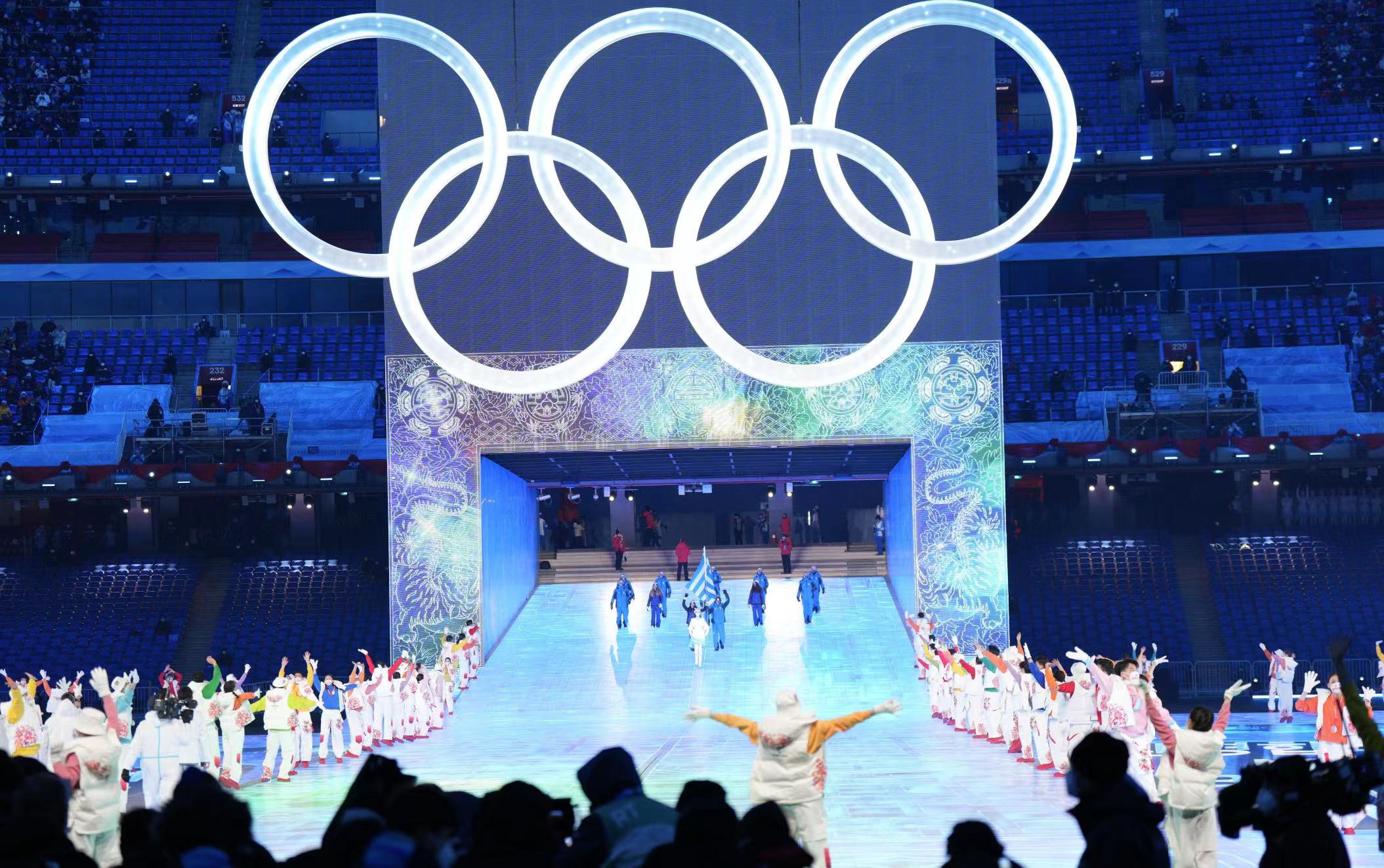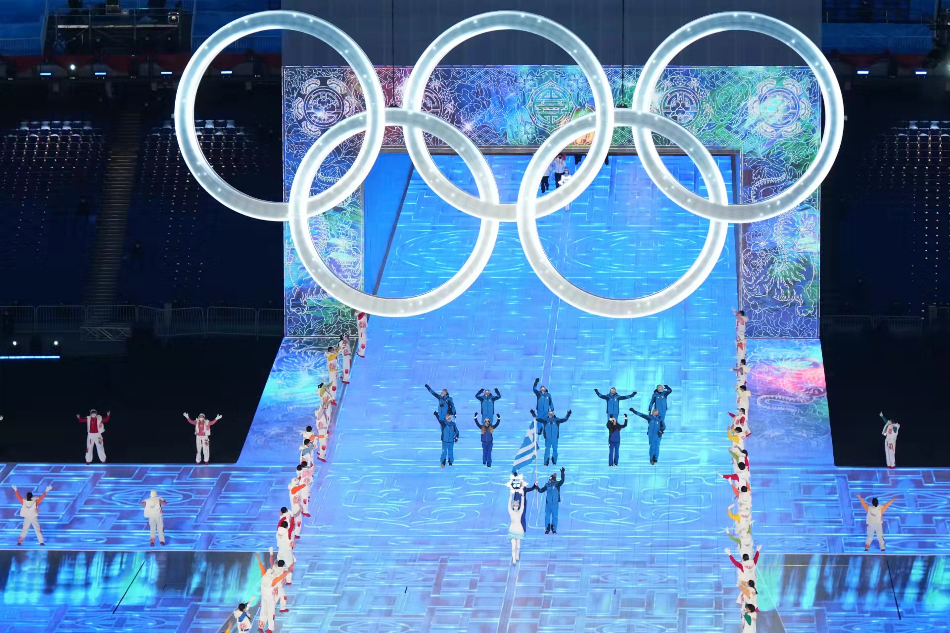 冰雪五环亮相后,鸟巢场地正后方,“冰瀑”变幻为两扇冰雕雪砌的“中国门”,希腊代表团率先走入,开启了整个开幕式中用时最长的运动员入场环节。