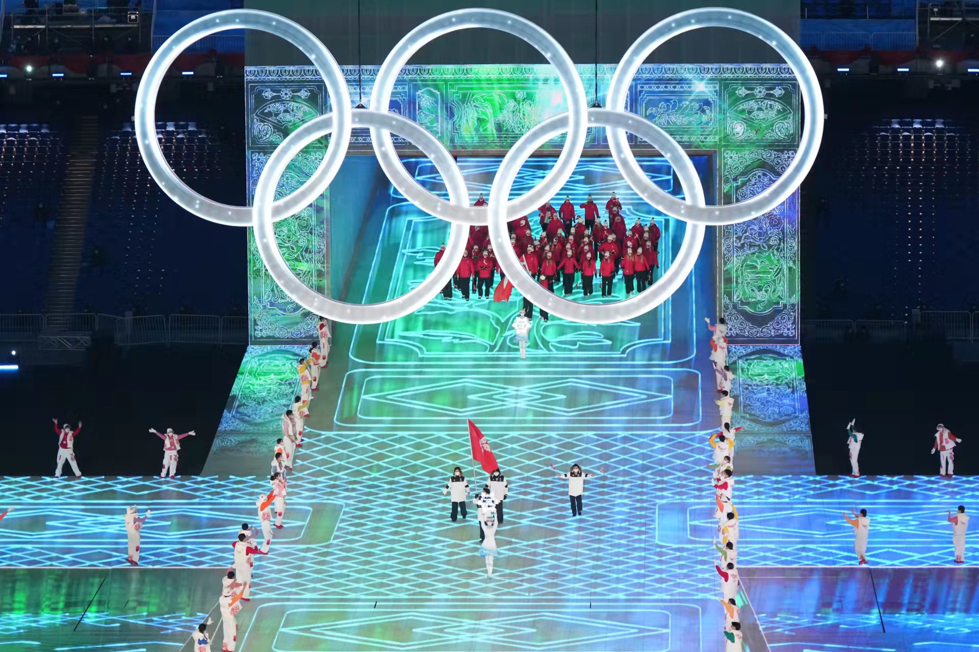 一点水墨滴落,幻化成“黄河之水天上来”的奔腾气象,从鸟巢“碗口”倾泻而下,铺满全场,一方水从中央升起,凝结成晶莹剔透的“冰立方”。24道激光从高处投射而来,雕刻反转。冰球运动员挥杆击“球”,“冰立方”逐渐碎裂,巨大的冰雪五环从中露出真容,缓缓上升。紧接着,6个冰墩墩共同推开场地正后方的“中国门”……