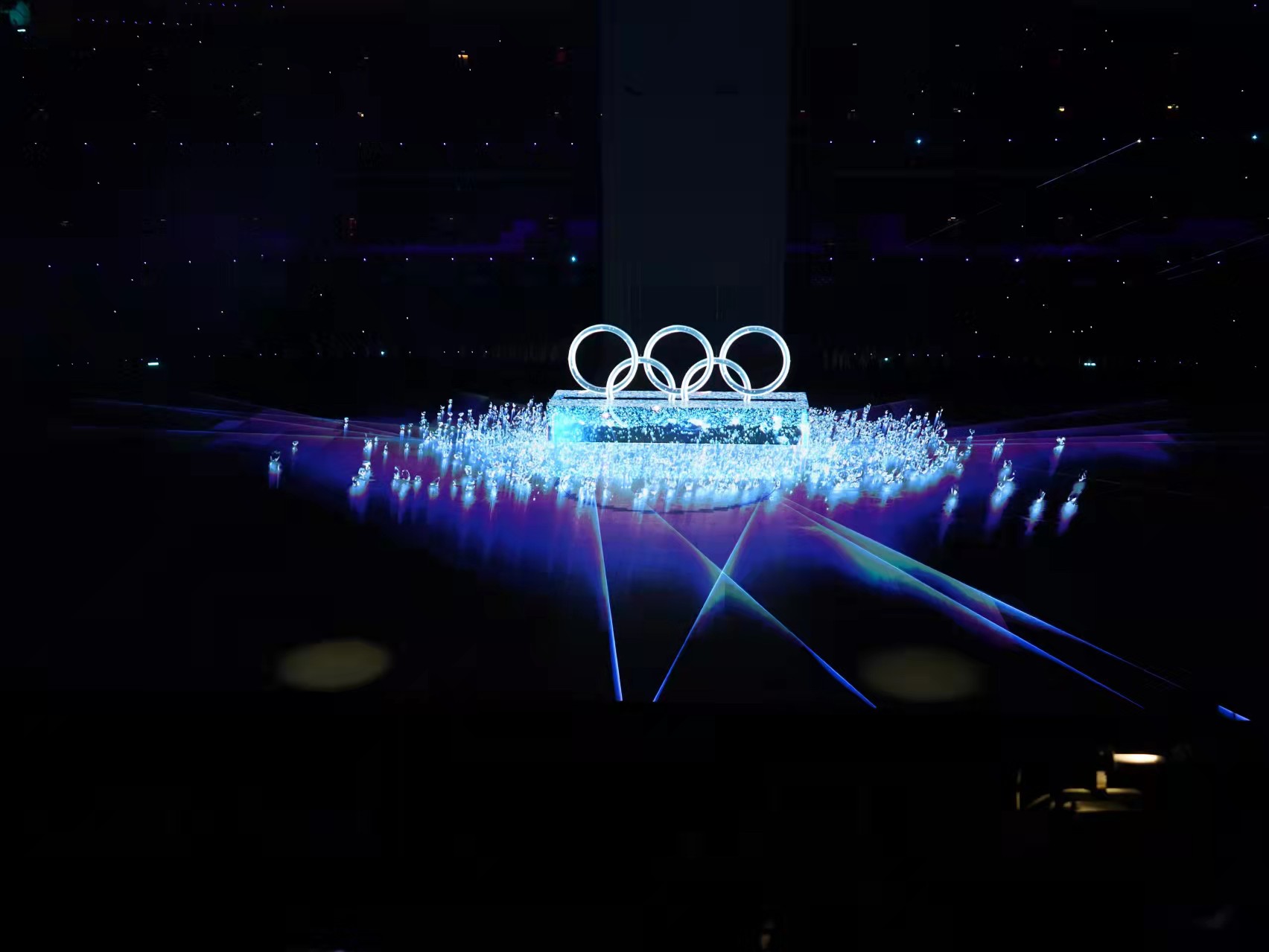 “这个部分的排练并不是很费劲。”分场导演陶雯婷认为,作为科技冬奥的标志性表演,五环呈现更多是在考验装置和影像的层层咬合,“合成时,我们会以音乐的点为基准发出口令,在那一秒钟,影像、装置都要对位,编程等方面的工作必须分秒不差。”一旦咬合不准,就可能出现激光还未到位、“冰立方”已经开始碎裂等情况,“奇幻感”会被瞬间破坏。