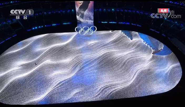 《致敬人民》还包含着一段精彩的轮滑表演,与2018年平昌冬奥会闭幕式上的“北京8分钟”承接呼应。24名来自北京体育大学的学生在地屏上划出流畅交织的线条,“既像跑道,又像中国结”,继而引出“更快、更高、更强——更团结”的奥林匹克格言。