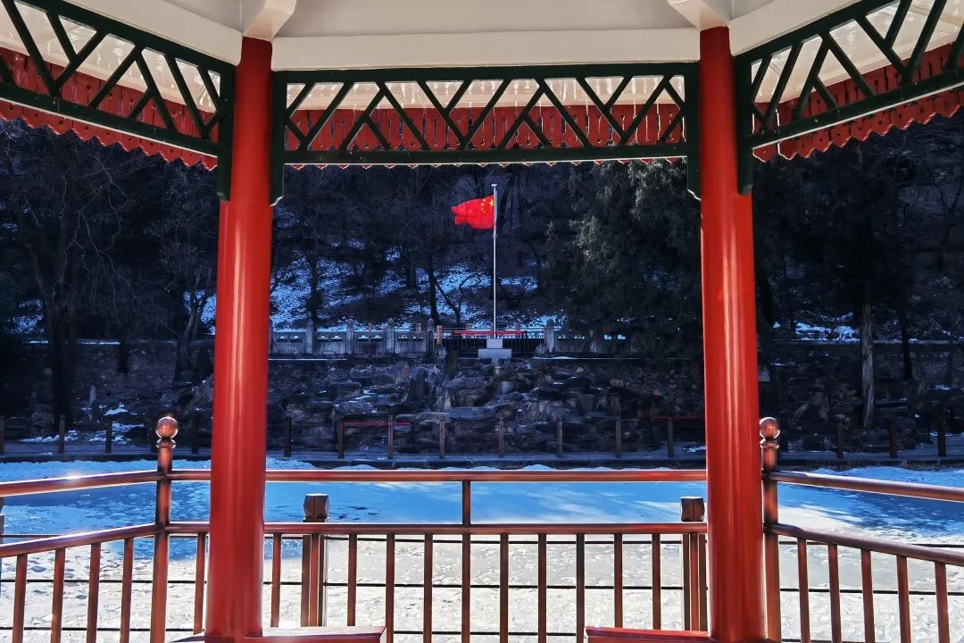 春节期间,五星红旗飘扬在双清别墅的上空,向祖国传递祝福。