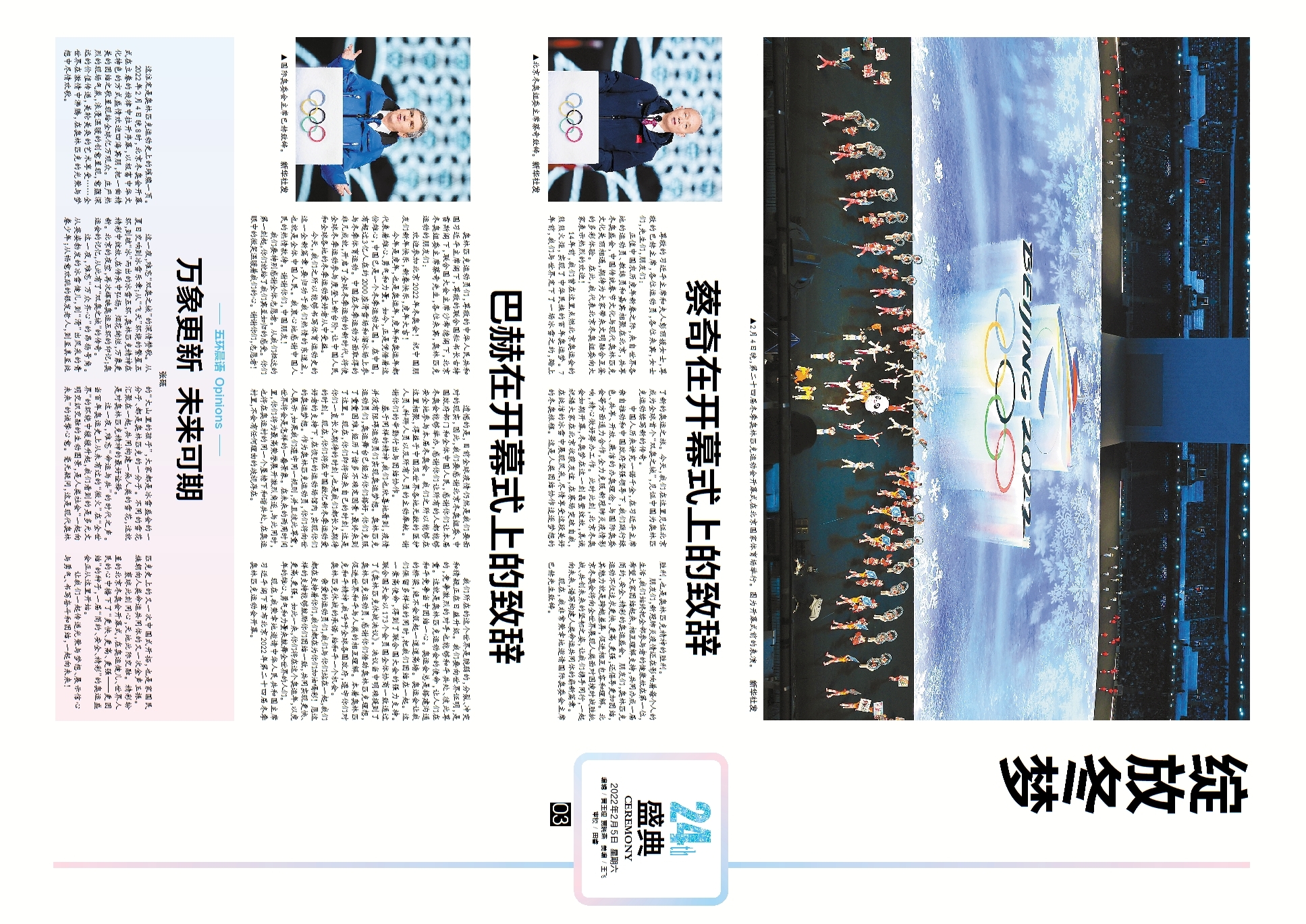 2月5日出版的《北京2022年冬奥会和冬残奥会官方会刊》用24个画卷式的全彩版面,以全景式、全记录的方式,为您呈现开幕盛况。