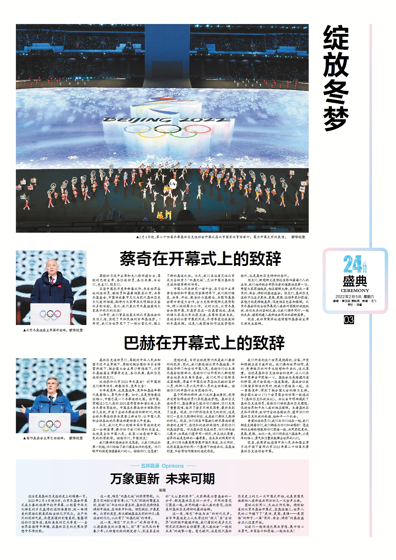 尊敬的习近平主席和夫人彭丽媛女士,尊敬的巴赫主席,各位运动员,各位来宾,女士们,先生们,朋友们: