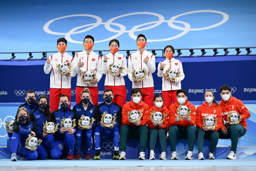 在赛后颁发纪念品仪式上,武大靖、任子威、范可新、曲春雨、张雨婷向观众致意,中国体育代表团在本届冬奥会上的首金,就此诞生。
