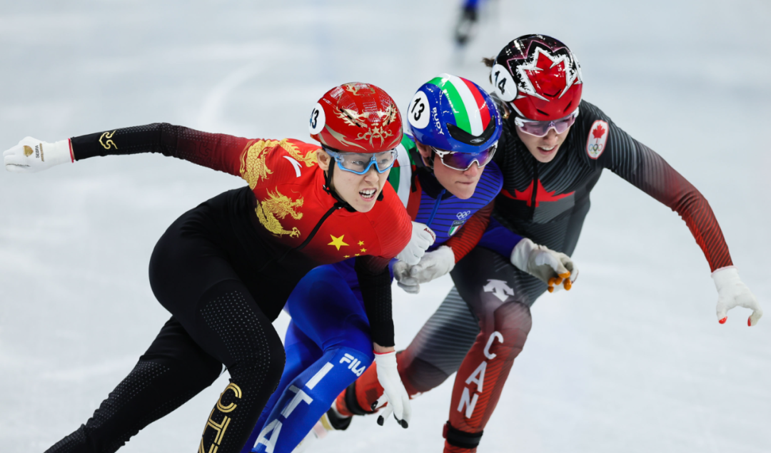 2月5日,中国队选手任子威(左二)与队友曲春雨(左一)在决赛中。新华社记者杨磊摄
