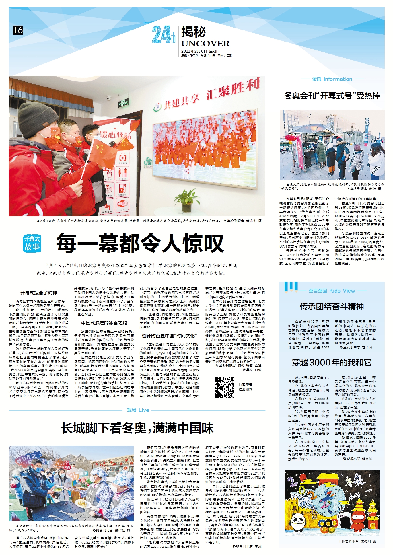 开幕式恰逢立春,精彩纷呈。2月5日出版的冬奥会刊用24个画卷式的全彩版面,以全景式、全记录的方式,为读者呈现了一场难忘而精彩的开幕盛典。
