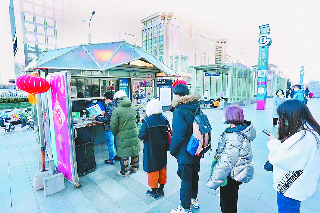 ▲崇文门站地铁口附近的一处邮政报刊亭,市民排队购买冬奥会刊“开幕式号”。 冬奥会刊记者 赵坤 摄