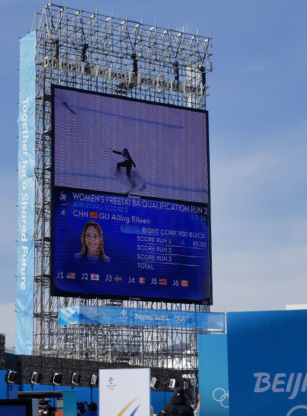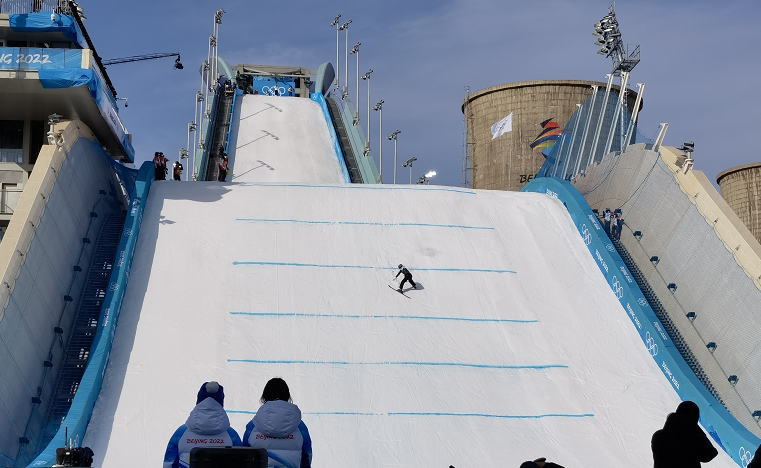 2月7日,自由式滑雪女子大跳台资格赛在首钢大跳台举行。第一跳获得89分的中国选手谷爱凌,在第二跳落地时出现失误。记者在比赛现场看到,不少观众稍稍起身,关切地望向谷爱凌。而后,场内很快响起“加油”“加油,谷爱凌”的呐喊助威声。