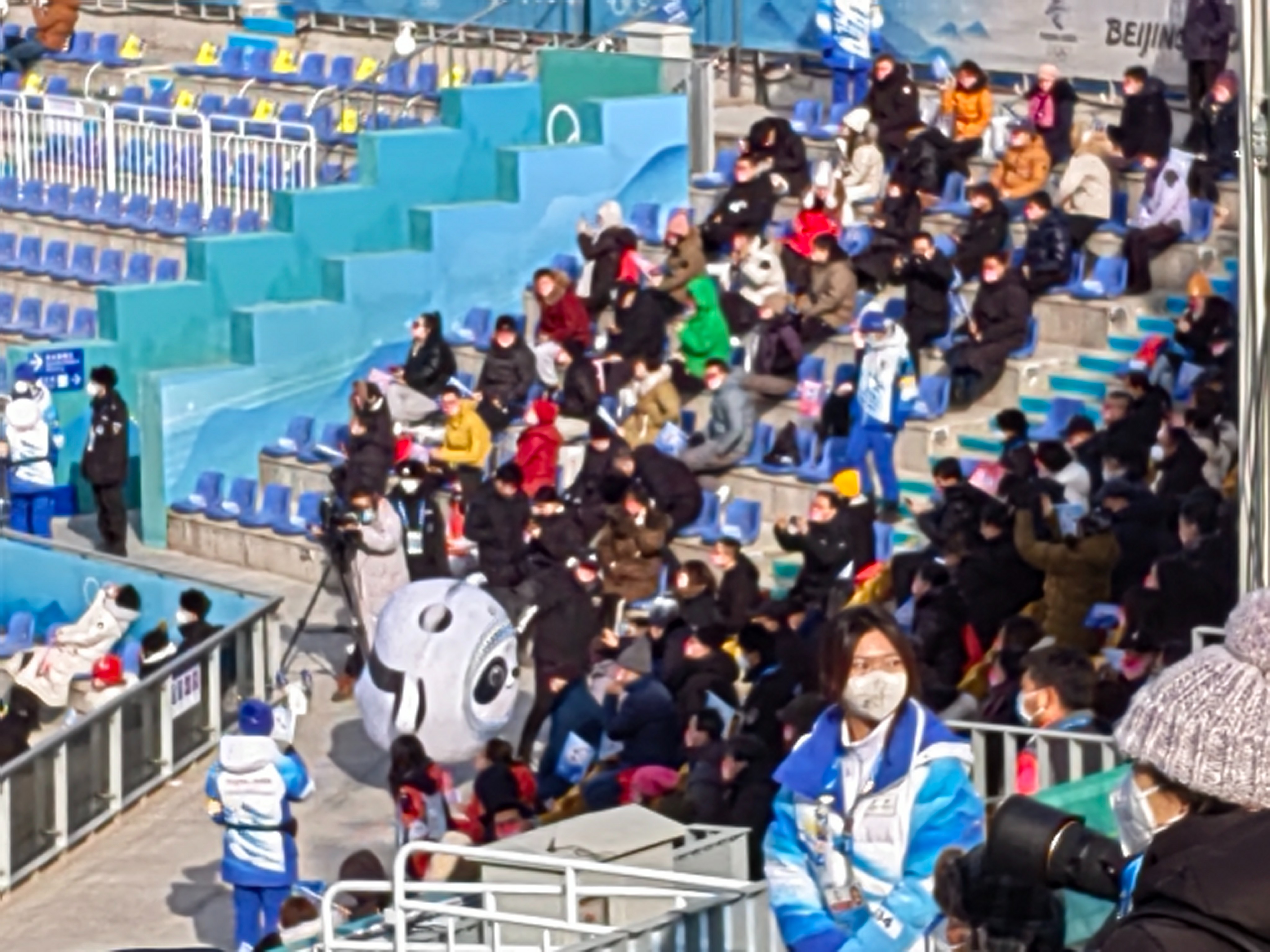 记者注意到,今天的赛场除了有不少观众,连冰墩墩都来给谷爱凌加油助威了。在谷爱凌三轮起跳的间隙,伴随轻快欢乐的现场音乐,冰墩墩都“及时”地出现在了观众席。他扭动着自己圆乎乎的身体,蹦蹦跳跳与观众互动,并用双手示意观众为谷爱凌加油,尽情享受比赛。