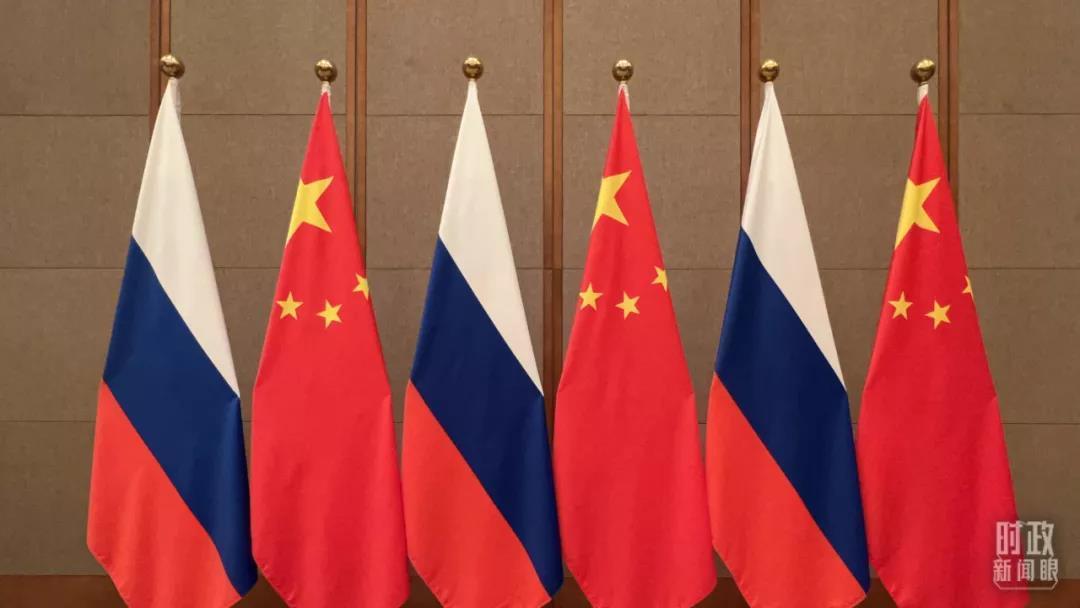 △2月4日,中俄两国元首会谈现场的两国国旗。(总台央视记者范学禹拍摄)