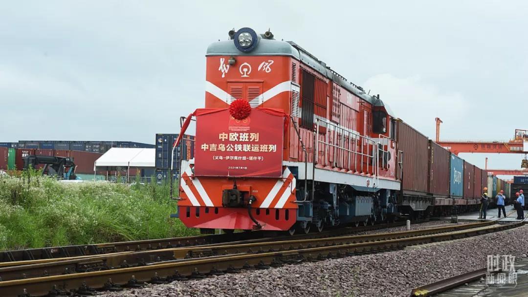 △2021年7月,长三角首趟“中吉乌”公铁联运中欧班列从浙江义乌启程,奔赴吉尔吉斯斯坦、乌兹别克斯坦。(图/视觉中国)