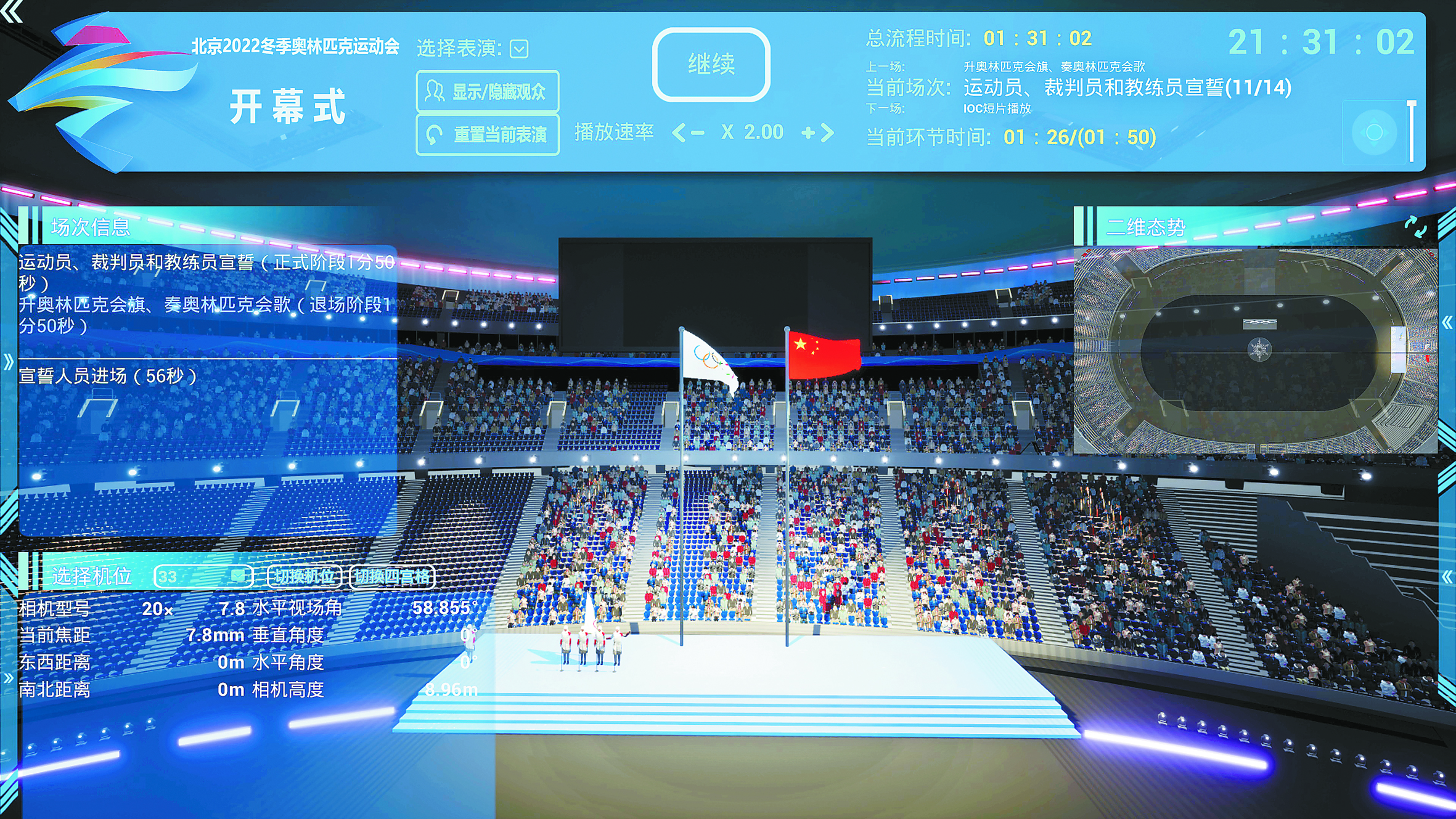 “我们通过三维仿真技术,模拟出冬奥会开幕式全流程,对演员、灯光、音乐、烟花、奥运火炬,甚至转播机位等全要素进行全方位‘排兵布阵’。”丁刚毅说,“这个平台的搭建相当于在线上进行了一场开幕式预演,是开幕式演出背后的‘科技大脑’。”在这个“虚拟鸟巢”中,开幕式的每一幕画面在不同机位展现的效果如何;每一名演员的步伐、位置是否精确;各类要素汇聚在一起是否完美配合,都能够在此进行模拟。据了解,该套仿真平台能够预演每一名演员的位置、动作、步伐速度,时间上则可以精确到开幕式的每分每秒,为开幕式的策划、设计和排练提供了有力的科技支撑。