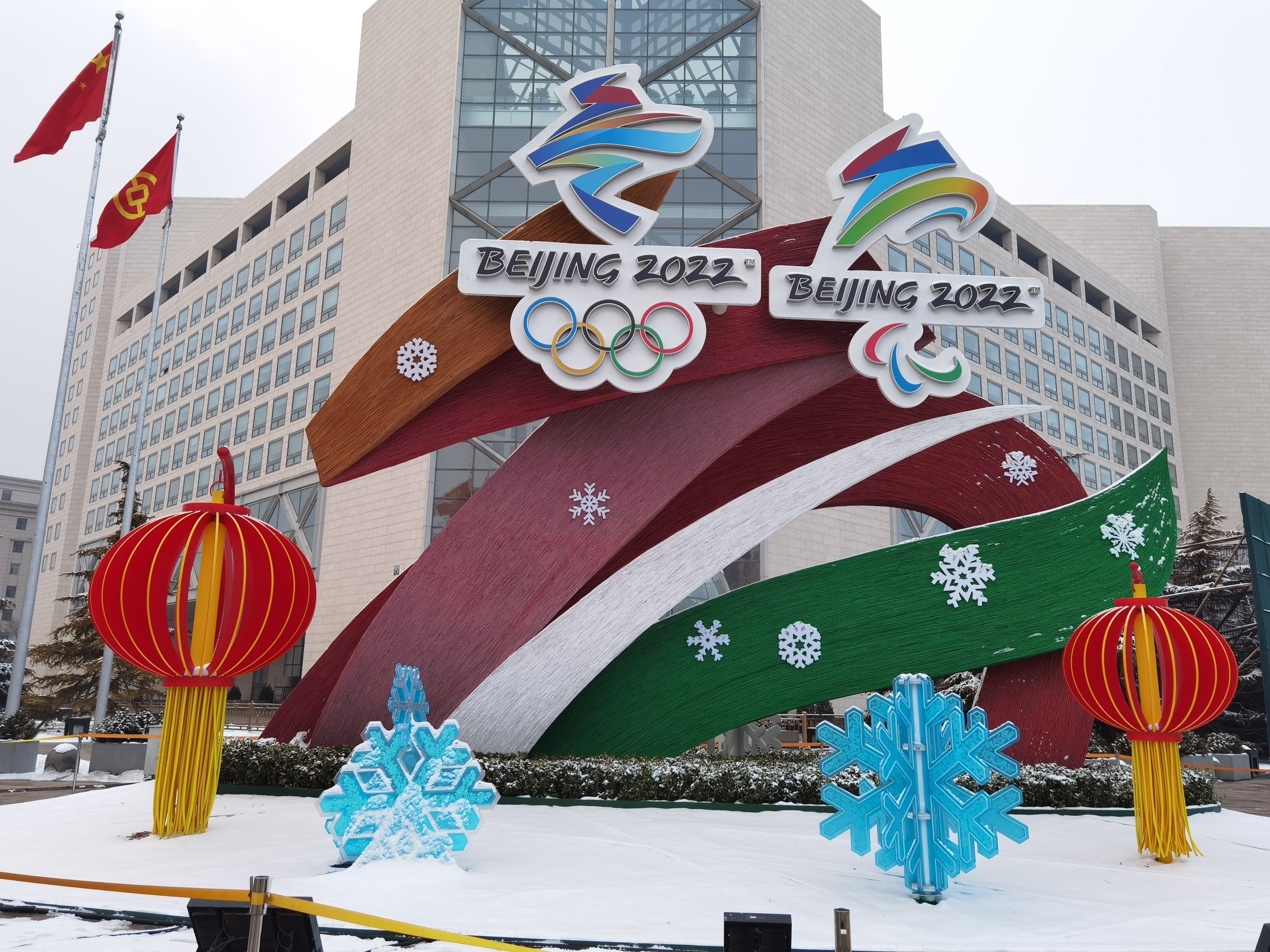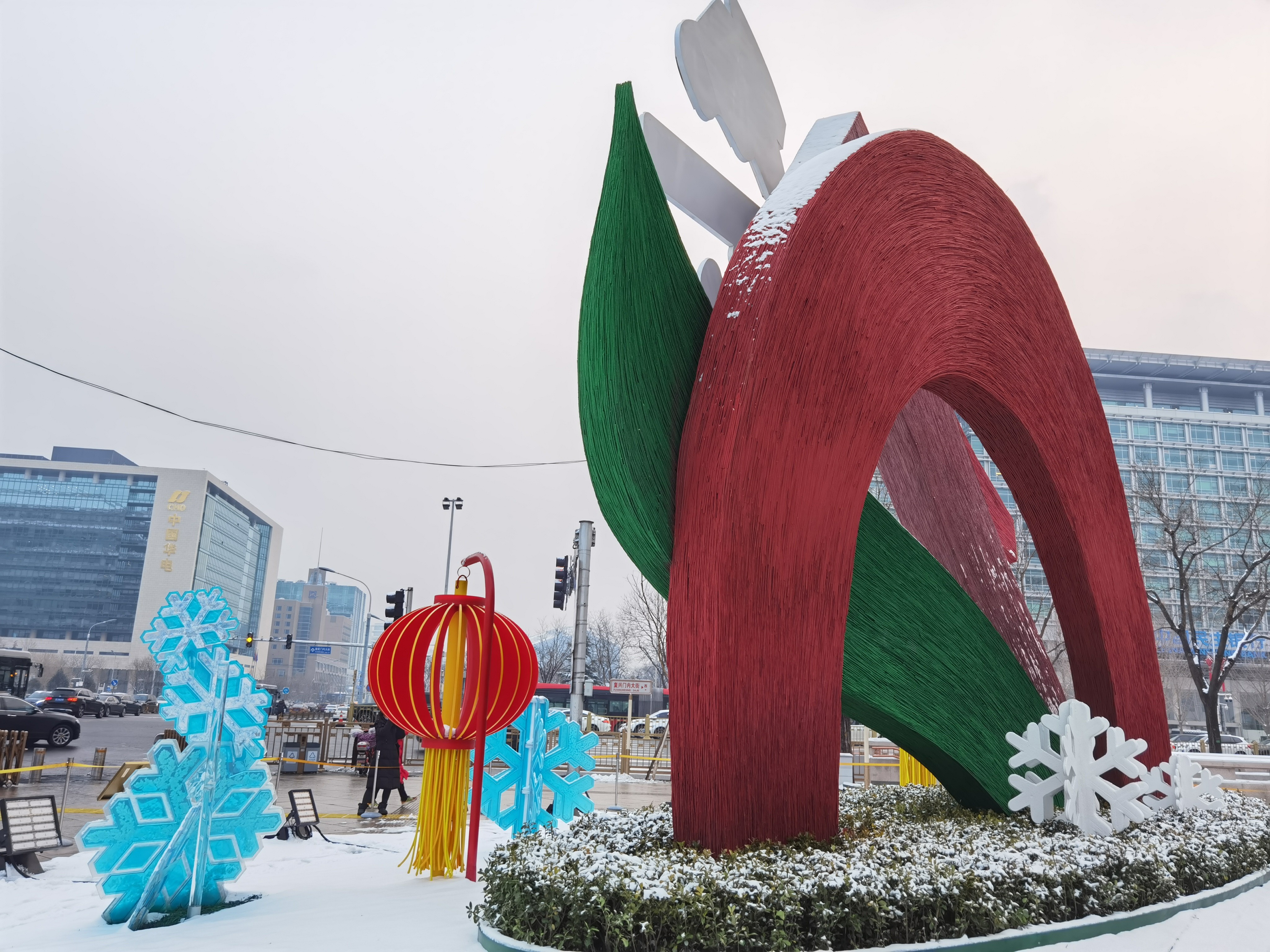 西单路口西北角,“开放冬奥”主题花坛前游人如织。这是一座顶高9.1米的大花坛,主景是冬奥会和冬残奥会会徽。散落地上的蓝白两色“雪花”格外惹眼。