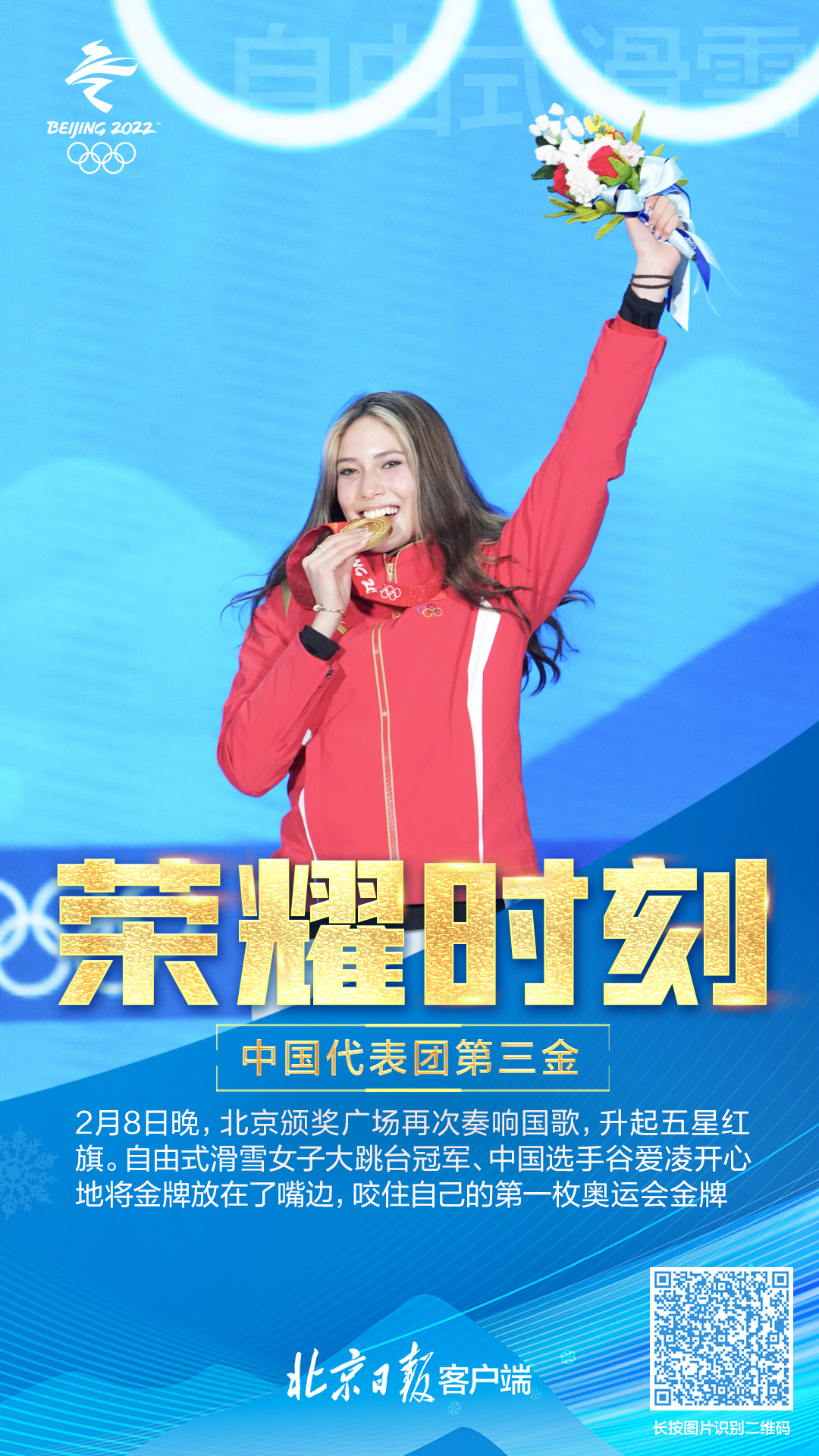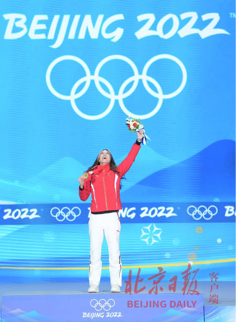 8日20时25分,北京颁奖广场再次奏响国歌,升起五星红旗。而这次获颁金牌的是自由式滑雪女子大跳台冠军、中国选手谷爱凌。