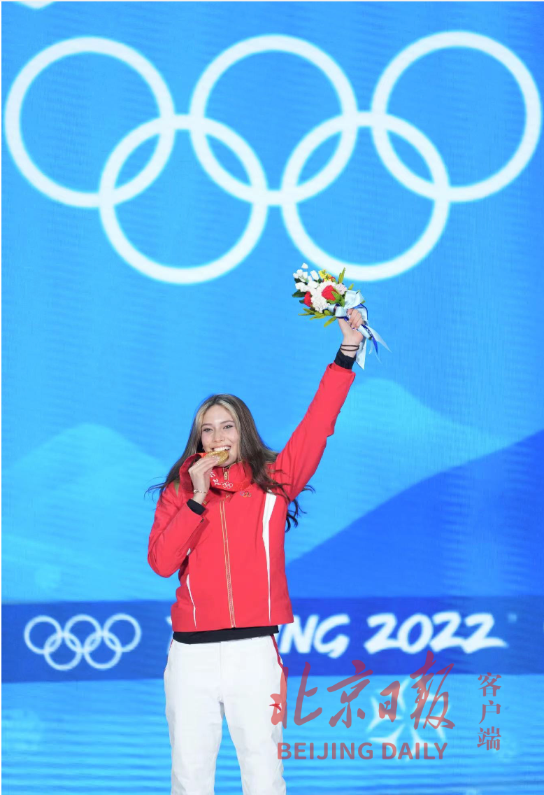 为谷爱凌颁奖的是意大利国际奥委会委员。拿到金牌后,谷爱凌开心地将金牌放在了嘴边,咬了一口属于自己的第一枚奥运会金牌。