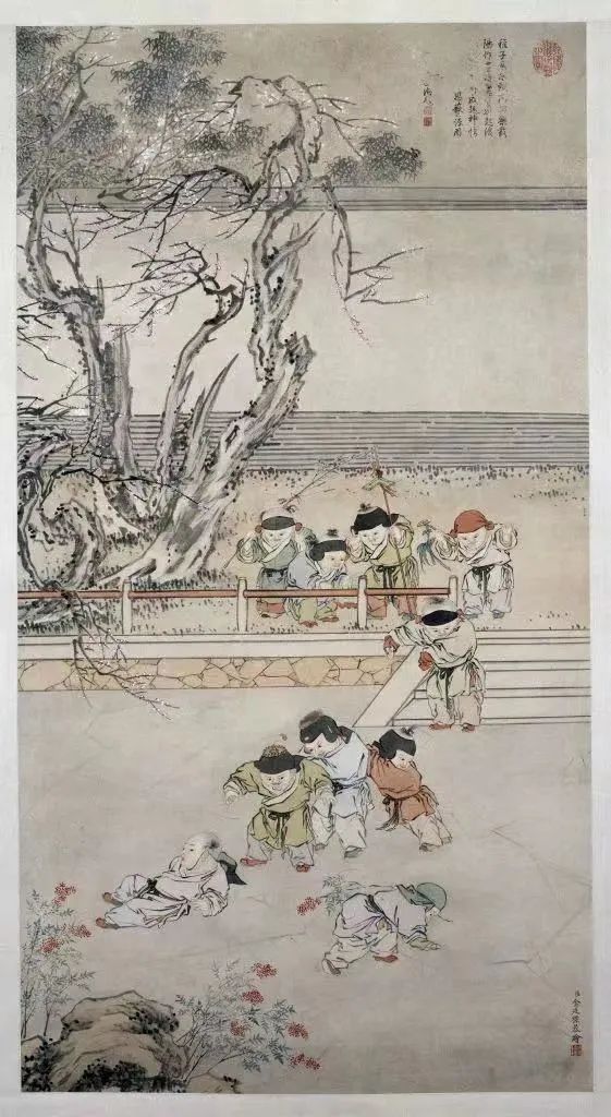 清朝宫廷画家金廷标绘制的《冰戏图》,几个小孩在冰上滑倒了,另外几个小孩站在台阶上观望犹豫不决。(图片来源:故宫博物院官网)