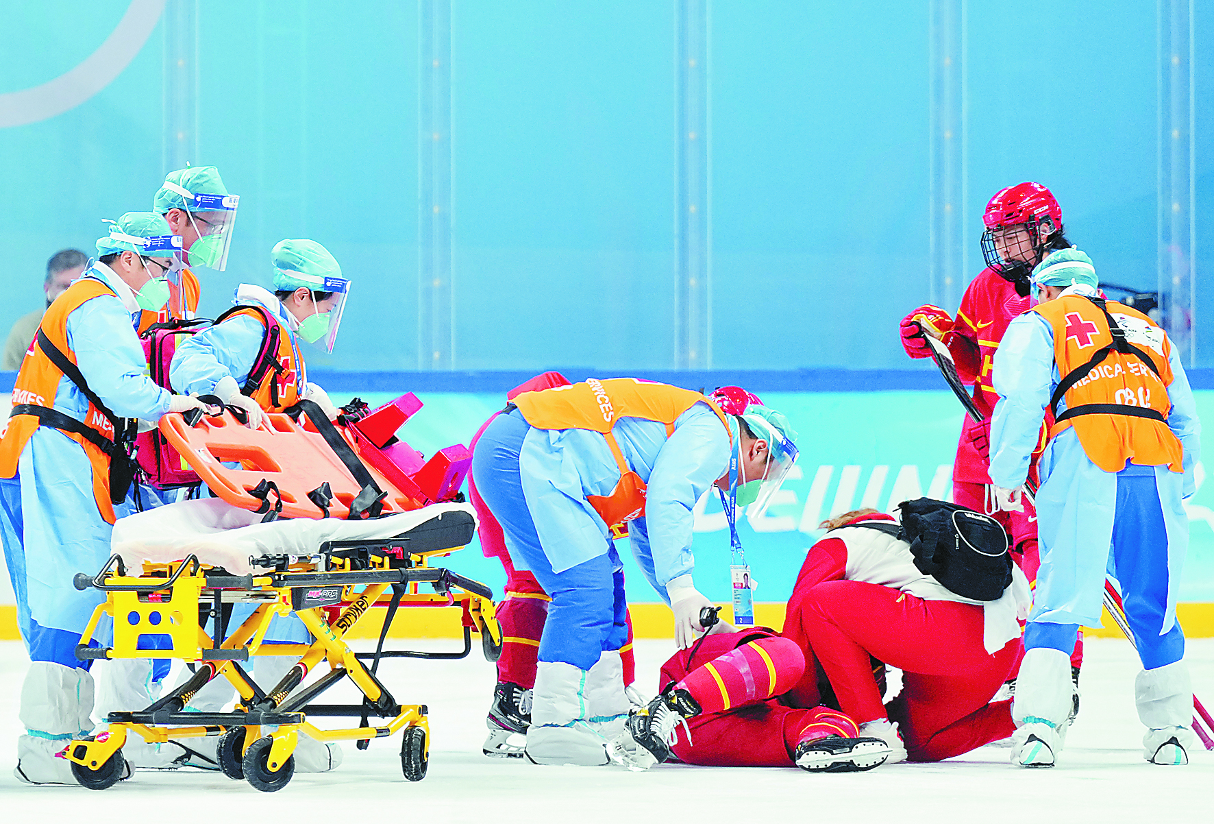 ▲五棵松体育中心,一名女子冰球运动员受伤,医疗保障团队立即进场救治。